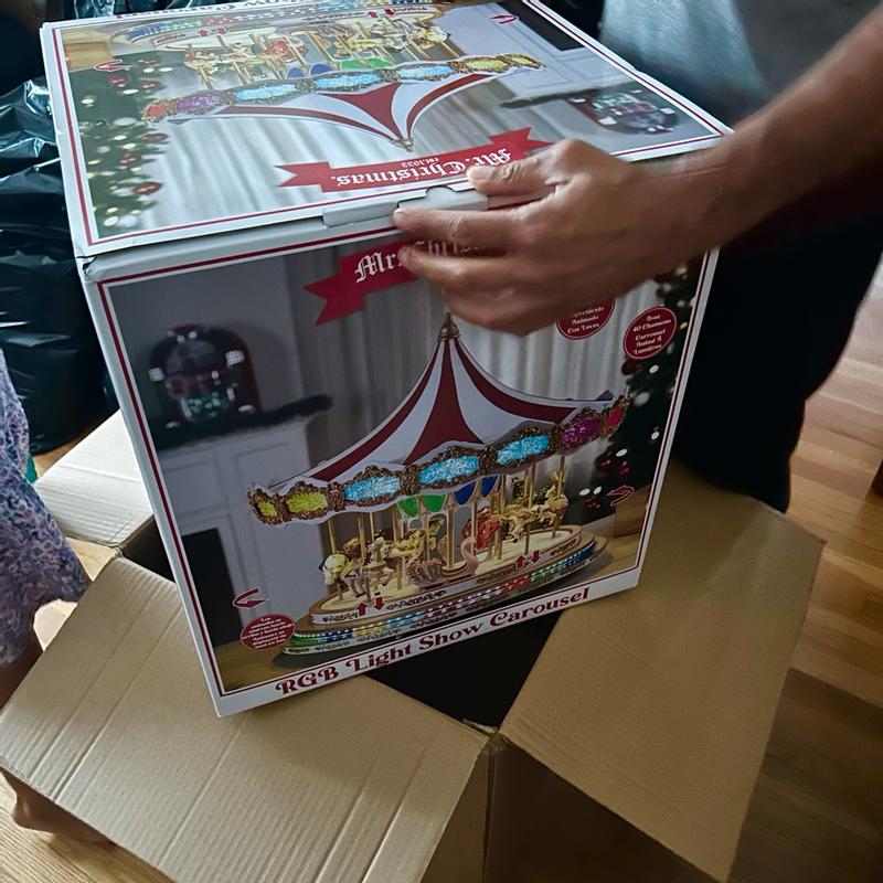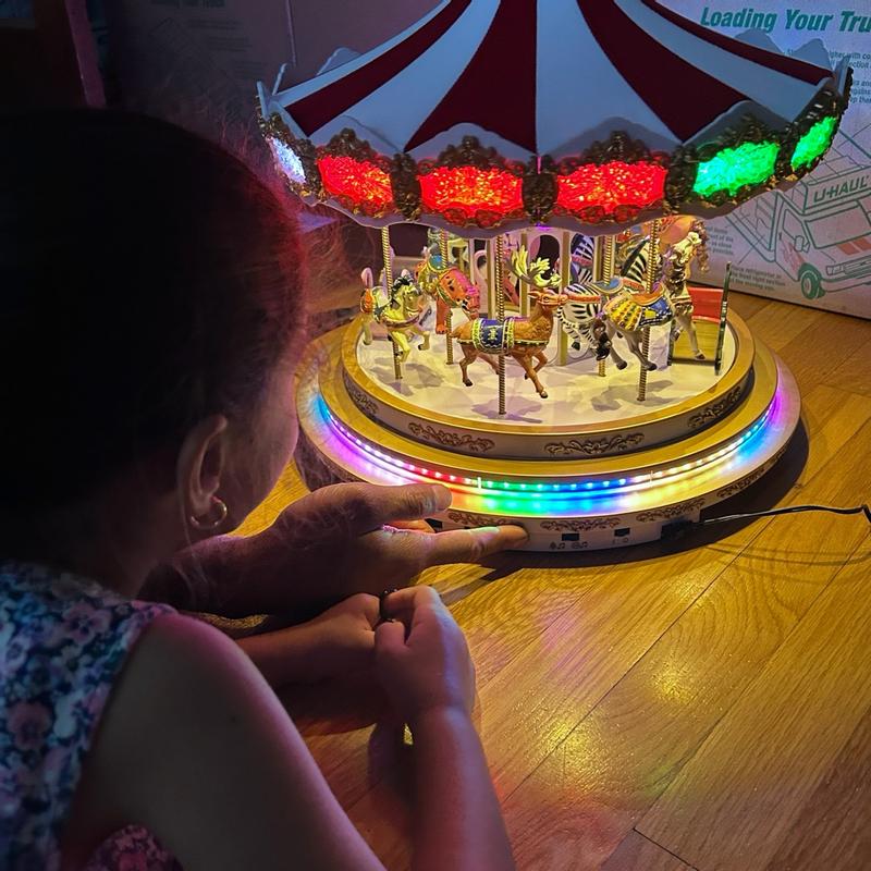 This carousel is a masterpiece! I was honestly shocked by the size of the box, but it was well packaged. For some reason, I thought it had wooden parts. Aside from the velour top, it’s all plastic. Still, the craftsmanship is beautiful and every little element makes it feel special. My daughter kept saying how beautiful it was, and even my husband was impressed. He said it’s something we’ll keep forever and it’ll be our new family heirloom. He really liked that it plays both classic carousel tunes and Christmas music, so it’s not limited to just the holiday season. The only thing he mentioned was that he wished the LED strip had a frosted cover to blend in better, but we get that it’s meant to mimic a traditional carousel. I can see why it has a higher price point. The quality, design and movement of the animals make it worth it. I also love that the volume doesn’t reset when turned off. The colors are vibrant, the sound is clear and we found ourselves just sitting there, watching it spin for nearly an hour.