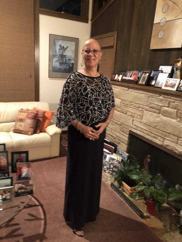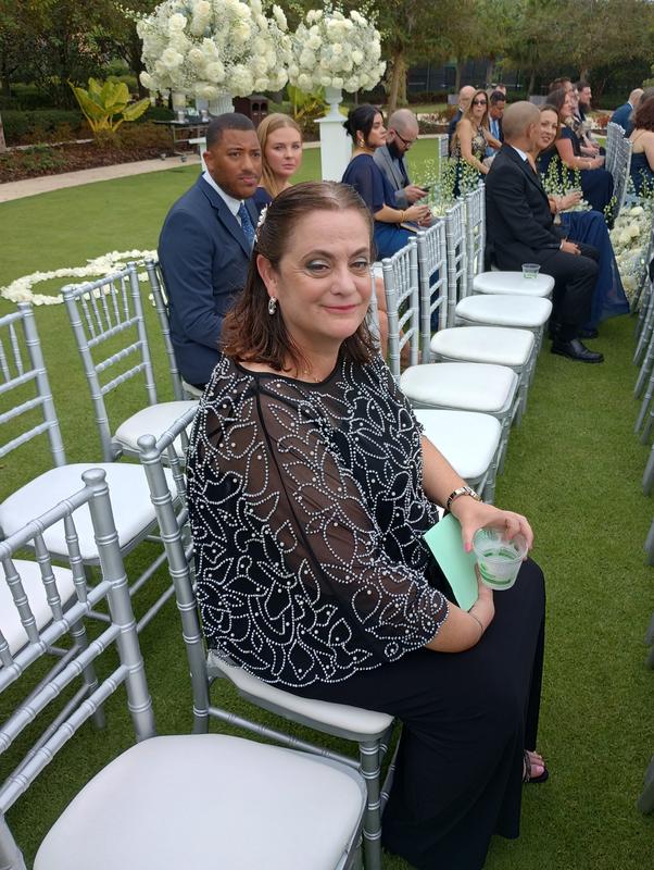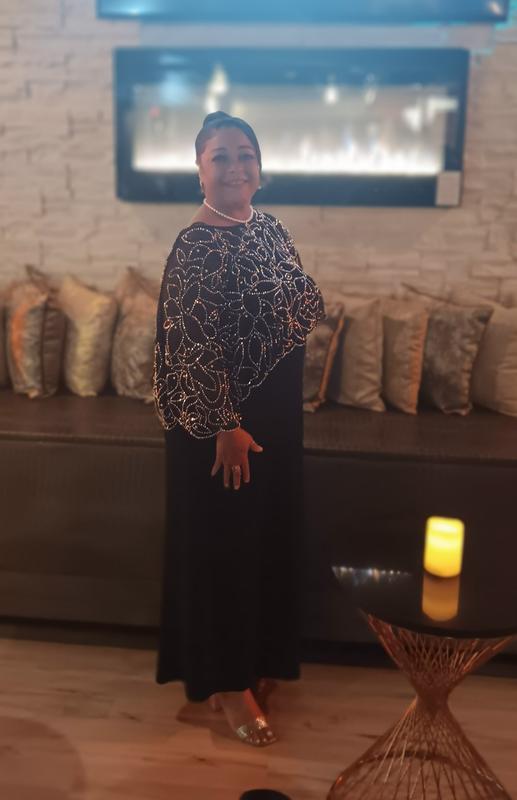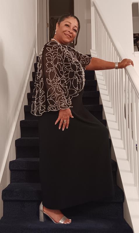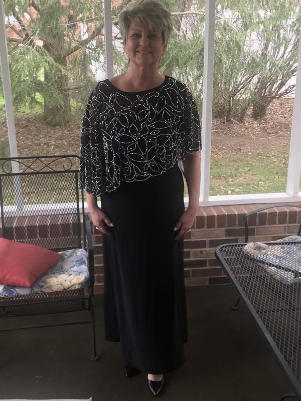 Beautiful drape on the dress, very comfortable. Love the cape just enough sparkle for a celebration. Perfect fit.