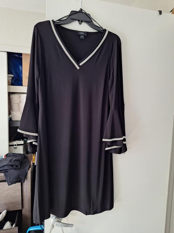 The fabric is light and forgiving even though it’s not lined. Love the bling on the sleeves and neck. I am 5’6” and it hits right above the knee.
