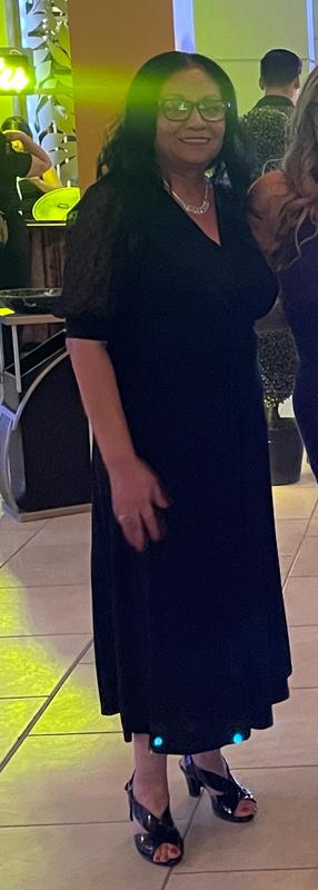 This dress was perfect for a wedding I recently attended. I am a little thicker in the belly area and the little twist in the front camouflaged that area!! It was so comfortable too.