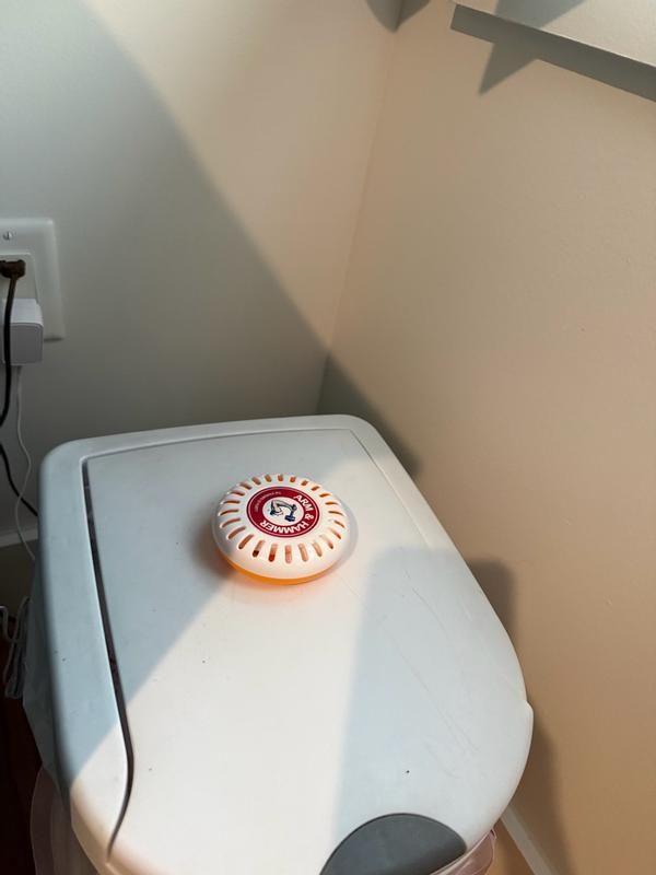 I was a little skeptical of the arm and hammer puck by Munchkin, but it actually works. It’s a fairly simple design in the shape of a puck that has multiple uses. Personally, I use it at the bottom of the trashcan that we put our baby’s diapers in and it helps more than I thought it would.
