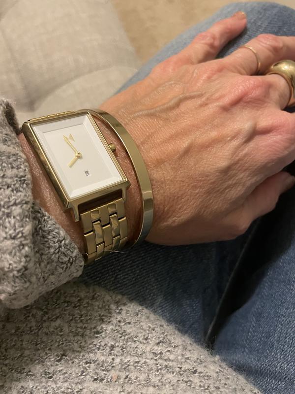 The face tiny looking on my wrist not as trendy as I had hoped, together with the intense gold color it looked very dated looking. Returned in favor of a watch with wider face.