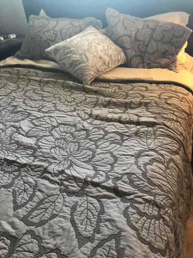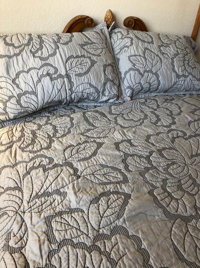 Quality stitching, pretty pattern, lovely gray color (not light or dark). Fits queen size bed well. Wish is were a bit thicker and warmer but nice for Fall or Spring or coupled with another blanket.