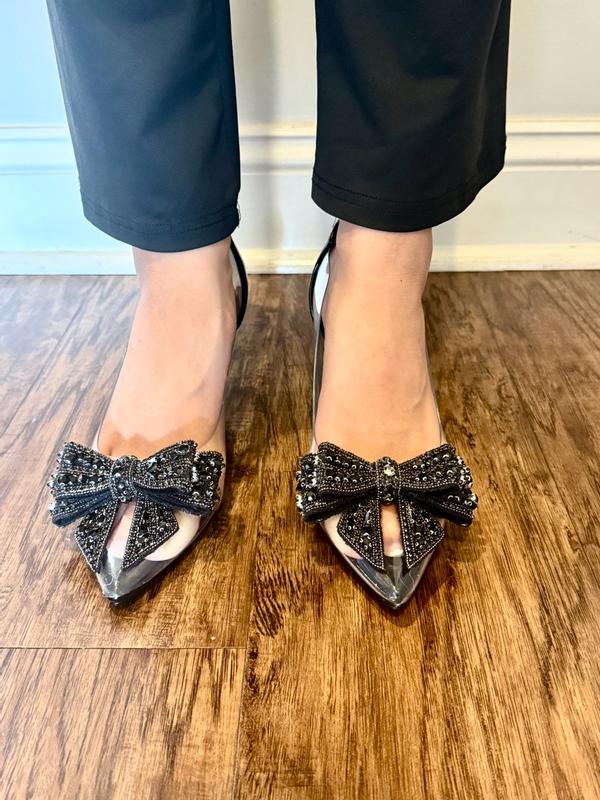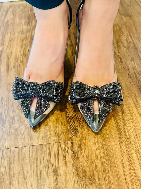 I absolutely love these beautiful BERNESS shoes. They have a feminine and elegant design with an oversized bow adorned with sparkling rhinestones. The transparent upper and elegant pointed toe add to their sophisticated look. The cushioned insole provides all-day comfort. The moderate 2.5-inch stiletto heel offers the perfect balance of height. Ideal for special occasions, formal events, or elegant evenings. They arrived just in time for Christmas, and I wore them and showed them off to everyone. They helped me make a strong impression with their stunning transparent design and sparkling oversized bow.