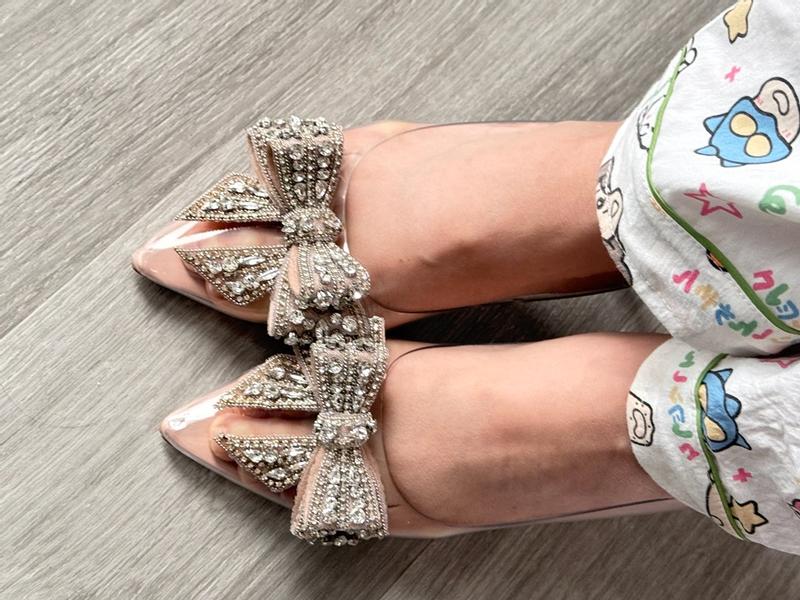 Okay, but can we talk about these shoes?! 😭💖 I just got these in and I had to try them on immediately (yes, even with my pajamas on, don’t judge lol). Honestly, I was prepared for them to be a "sit down only" kind of shoe, but they actually fit perfectly. No weird rubbing or toe-pinching, which is a miracle for a pointed heel. They are so cute in person, the bows are super sparkly and they give such a "Cinderella" vibe without feeling too extra. If you’ve been on the fence about the clear shoe trend, this is your sign to just do it. I’m literally obsessed! 🎀✨