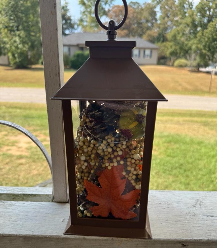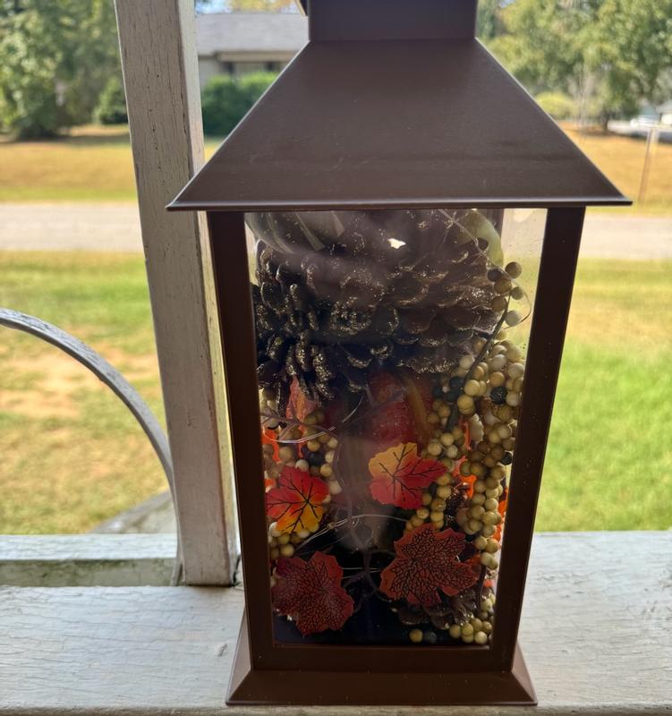 This is such a charming seasonal piece! The autumn-themed design instantly adds a warm, cozy touch to my space. The lantern is lightweight although made of durable plastic, but it doesn’t look cheap at all. it has a nice finish that blends well with my fall decor. The 10 LED lights give off a soft glow that really sets the mood in the evenings. Since it’s battery-operated, I can place it anywhere without worrying about plugs or cords. I have put it on my porch, and it looks great also adds welcoming feel. I really like it.