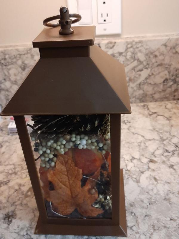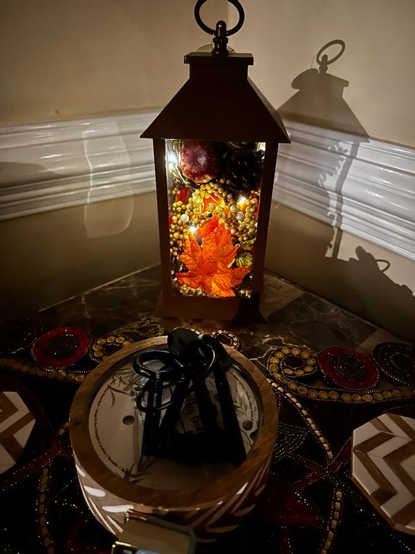 I was gifted a lovely Decorative Autumn Lantern with LED Lights to add to my seasonal decor. I love the stunning glow of the arrangement with the battery-operated LED lights on and off. It’s well-made and adds an elegance and festive highlights to our seasonal accent pieces in our home. Such a warm statement piece for our mantel.