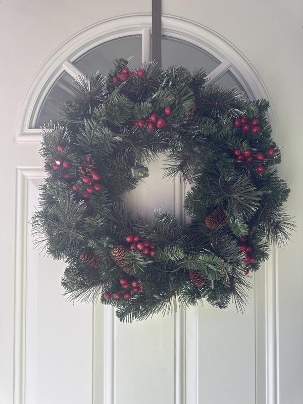 24" Crestwood Spruce Wreath with Silver Bristle, Cones, Red Berries and Glitter with 50 Clear Lights
