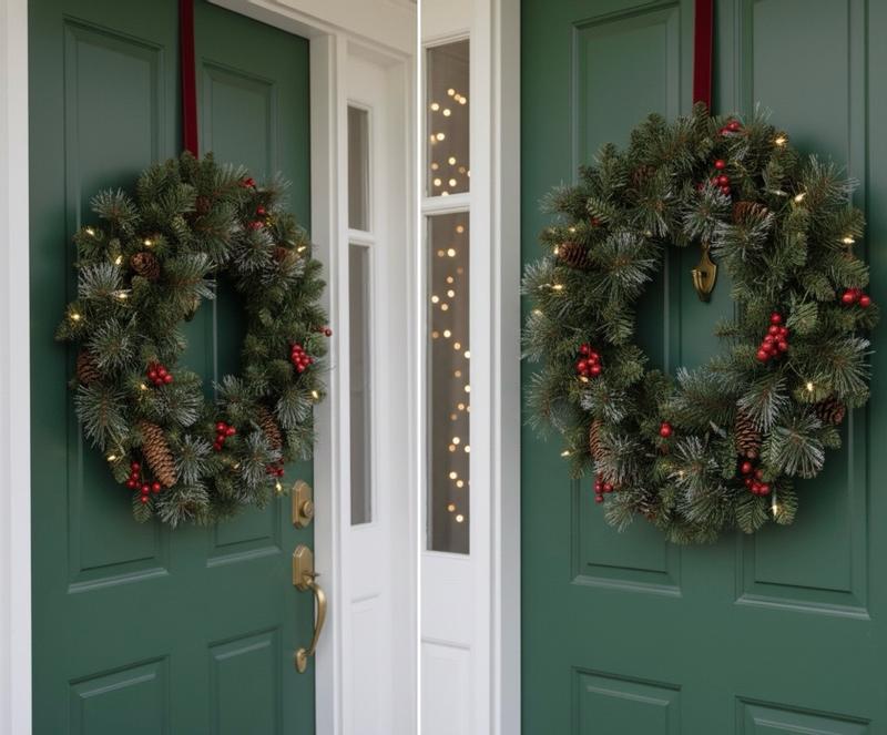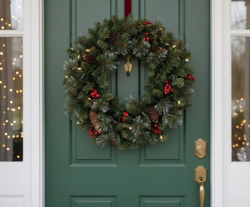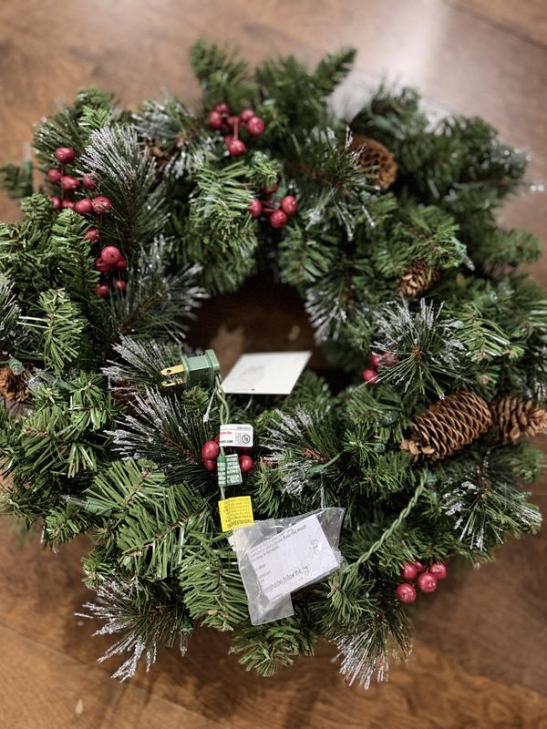 The wreath is beautiful and full. I only wish that the lights were battery operated. It has lights that are attached to a plug. I don’t have a plug near my door. Had to string on my own lights with battery operated mini lights.