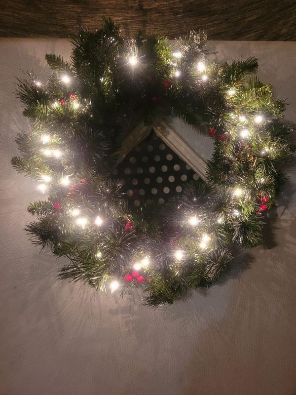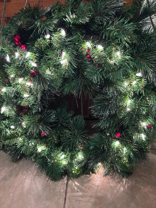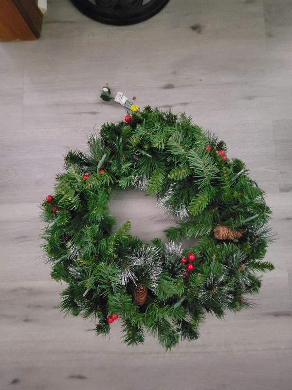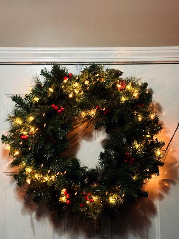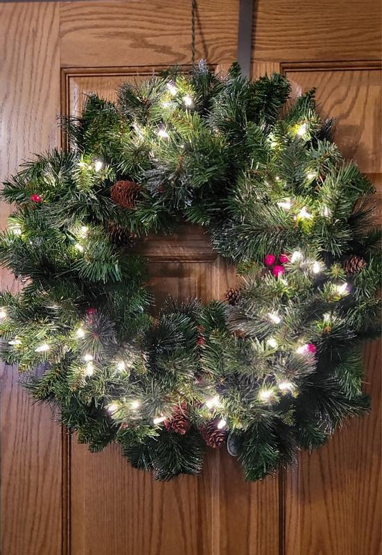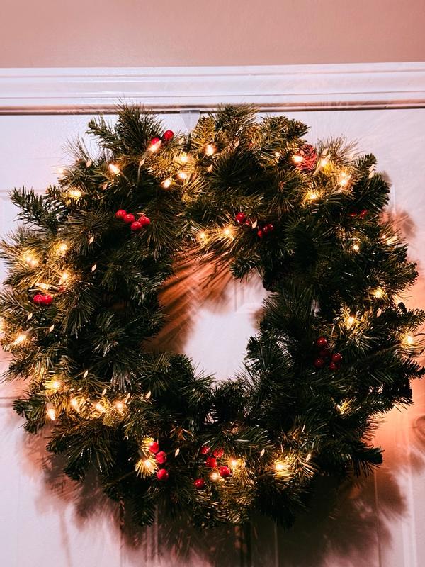 This wreath is beautiful and festive, with pine cones, berries, and glitter for a classic holiday look. The clear lights shine brightly and stay lit even if one goes out, making it a perfect decoration for doors, walls, or windows.