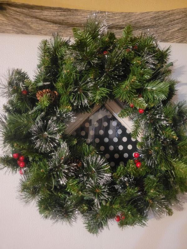 This 24 inch Crestwood Spruce pre-lit wreath from National Tree Company is a beautiful, high-quality wreath. First off, I will warn that when you pull it out of the box, glitter goes everywhere. It looked like a unicorn exploded in my kitchen. I wish I'd had some warning about this. However, after that initial removal and clearing out the box and shaking the excess glitter from the wreath, it is far less messy to deal with now. As I stated before, this is a beautiful wreath. It is sturdy with lots of body. It is realistic looking and I love the added accents of berries and pinecones. The greenery has two different needle types which adds style and interest. The glitter is very pretty and is done lightly and tastefully--more frosted than glittery. The clear lights bring warmth and depth to this wreath and really help set a cozy mood in the room. Great size and great quality. I highly recommend this beautiful item.