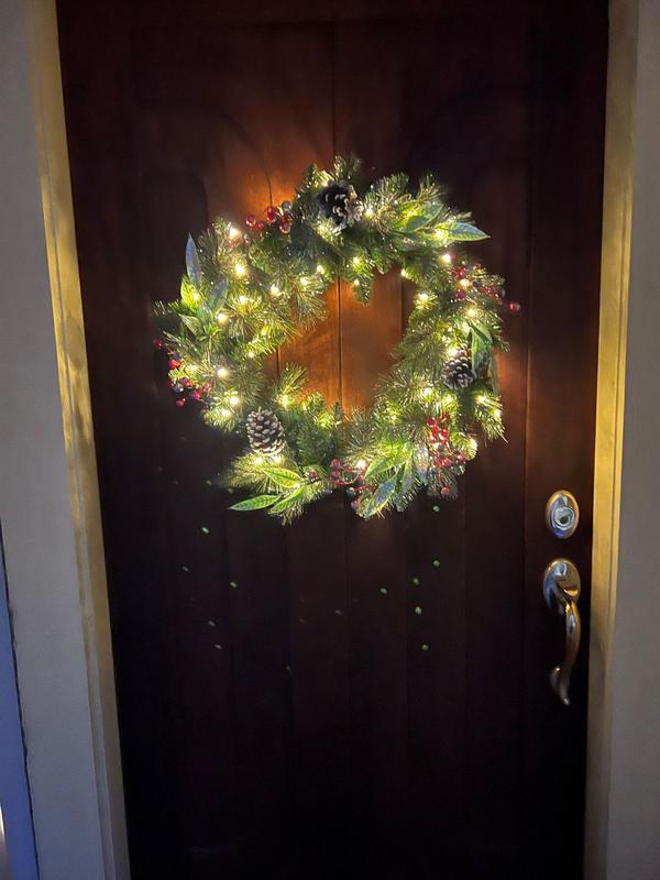 How disappointing! The wreath is nothing like the photo. The leaves and berries are not at all realistic, they're plastic and covered in sparkles. The wreath is very sparse and fake looking. The sparkles get everywhere. The lights and timer seem to work but the wreath is going back.