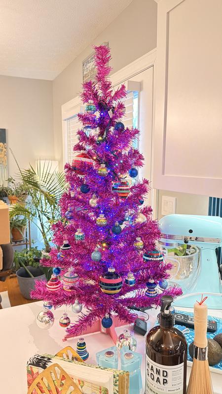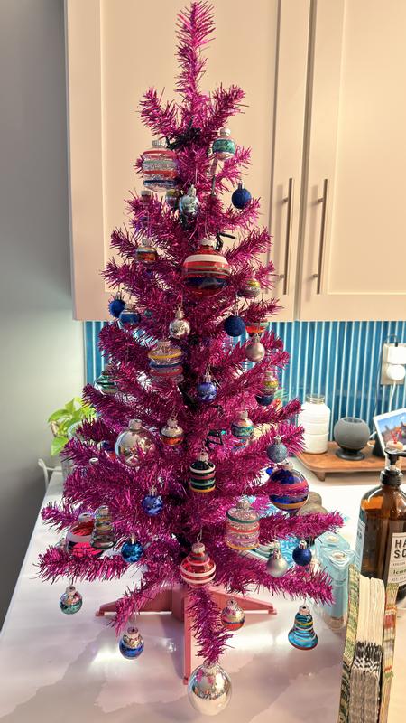 I was looking for hot pink tree. Beautiful tinsel tree that is perfect for a table or counter or office. More fuchsia than hot pink but an awesome color so i am happy with it. I bought this tree to display a bunch of shiny brite ornaments I had purchased and went with colored lights wrapped around the center pole to help them stand out.
