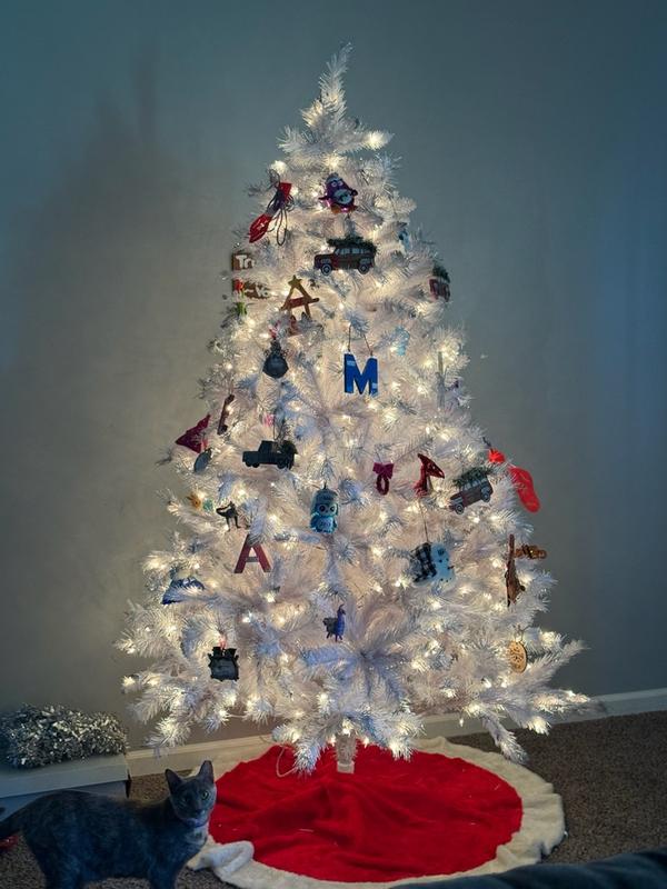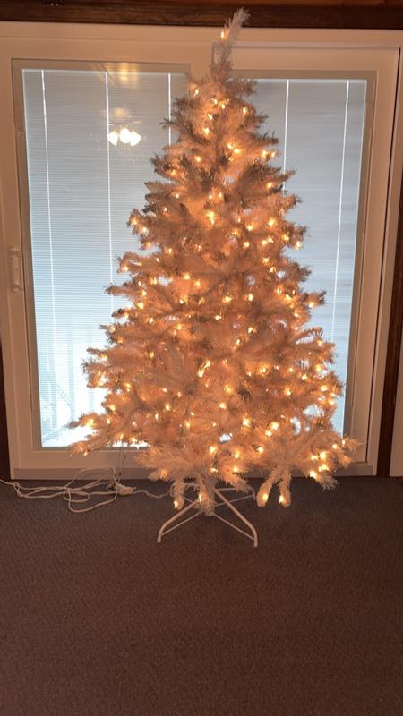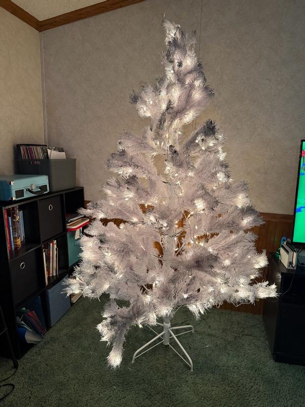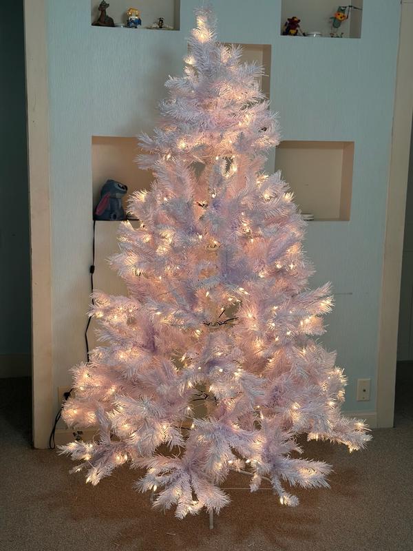 This Winchester white pine tree with clear lights is so pretty. We love Christmas in my house but we have never had a white Christmas tree. It was packaged nicely and easy to get the pieces out. Assembly was easy as well. It came in three pieces and it was easy to know which piece went in the base (included) and which went next and so on. It didn't take long ar all. It did take some time to fluff the limbs and spread them so it looked full. My only two complaints is that making sure the pieces were lined up so that you can plug the cords together was a little bit. Also there is a lot of glitter that gets everywhere. I was covered in it by the time I finished but the tree still looked nice so I dont hate the glitter but there was a lot and everywhere. All in all the tree is gorgeous and looks nice in the spot I placed it. 6.5 ft tree fits nice in our space. Definitely decorate it more close to the holidays (we load our Christmas trees with ornaments). We are gonna love having a white tree. Would recommend (just know there is glitter).