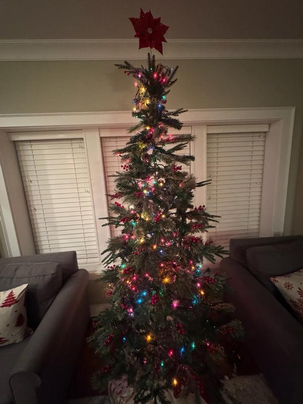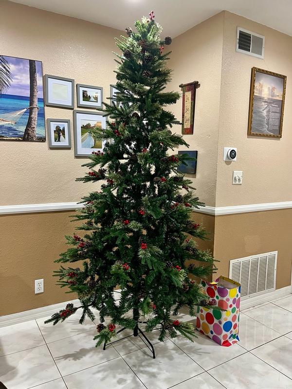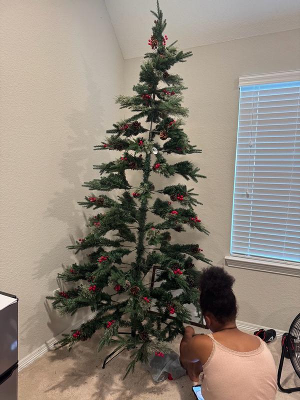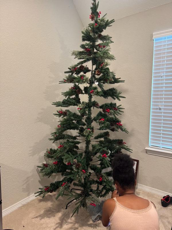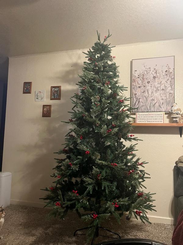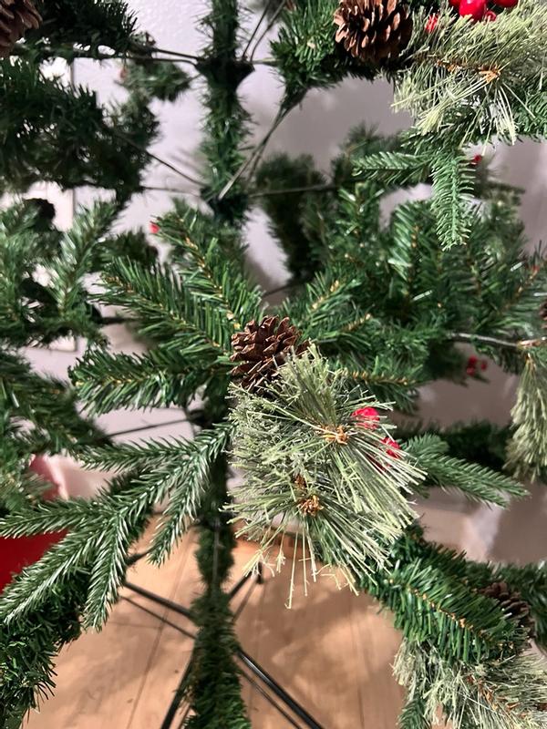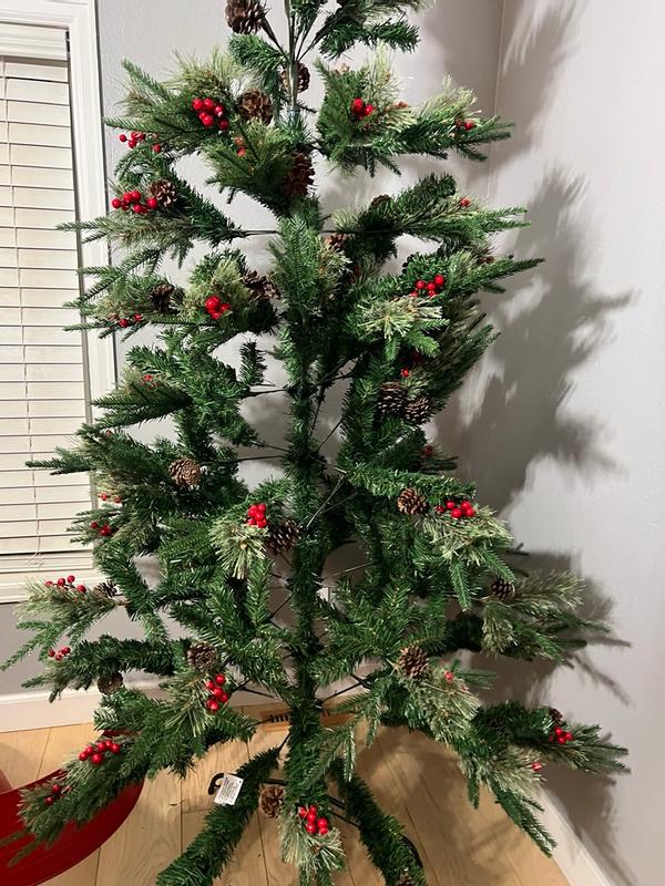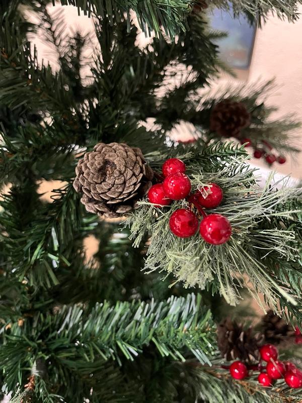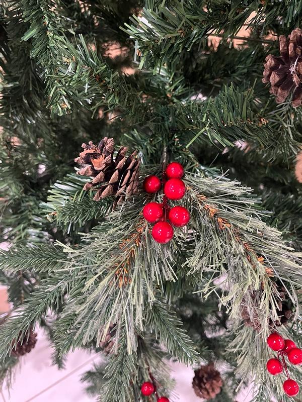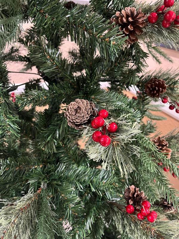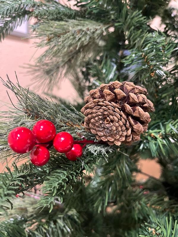 I like this tree and the details with the pinecone and berries added. I put the white lights on myself, not sure why it only looks like I did half the tree but itâs probably my camera đ. It had a good shape and is sturdy for the most part! The branches are easy to hang ornaments on and easy to fluff when fluffing the tree.