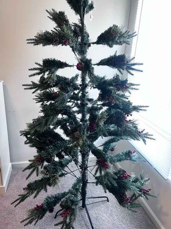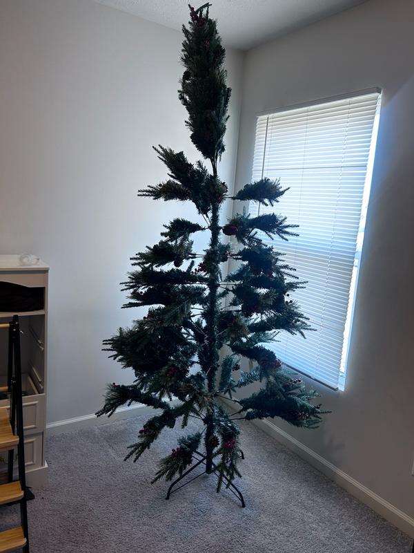 I really really wanted to like this tree, but unfortunately, the quality just wasn’t that good. First of all it came un flocked, which is fine but even with it flocked up it wasn’t as full as the photos made it seem. The little cranberries that were on there broke off with a slightest touch. They were just made of really thin Styrofoam and if you barely touch them, they just fell right off so we lost a lot of of them. The branches did not fluff up well at all in fact, the tree that I had purchased before getting this one was cheaper and it was twice as full as this tree was the size is nice although the thickness is not I was expecting really good quality and very excited about getting this tree because I love the design. The design is probably one of my top favorite Christmas tree designs but unfortunately, this just did not work for us. Good size. Not good width.