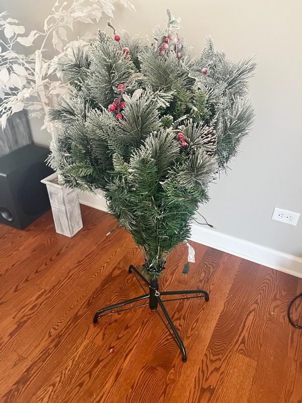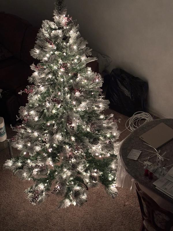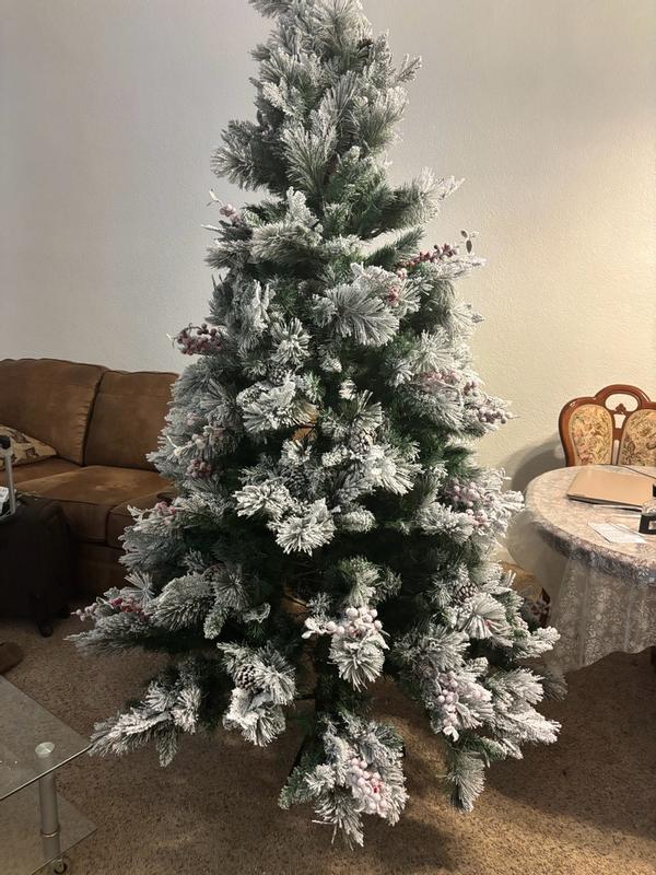 first off let me just start by saying what a gorgeous tree I got the 7 1/2 foot pre-lit snowy Bedford pine tree with white lights and I am just in love with it it’s a very heavy tree I had to open the box and bring it in the house piece by piece and each individual piece was fairly heavy but it was super easy to put together each section was labeled by number and it was only three pieces so you couldn’t really mess that up and then since it was new of course it took a lot of fluffing but it’s gorgeous!! no holes ,no see-through areas at all .I love the berries and the pinecones and the snow on every effect, there’s even snow on the lights which makes it look really beautiful. There was not a lot of fallout from the flocking ,honestly there was just a small pile of dust on the ground which was to be expected , but it wasn’t very bad at all I say 10 out of 10 on this gorgeous tree.