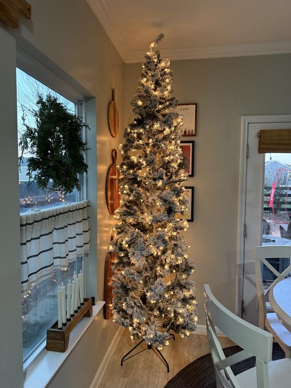 Easy setup. Surprisingly good, solid tree for the sale price paid. Flocking does shed & drop on floor but nothing a vacuum cannot pick up. It's great height for a room with 10ft. ceilings. Nice & narrow. Doesn't take up much floor space, so it's great with small areas.