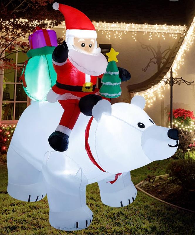 This inflatable Santa riding a polar bear is a great outdoor decoration. It was very easy to set up and inflates quickly for its large size. It comes with ground hooks that keep it secure, so it doesn’t move around and holds up well in different weather conditions. The built-in lights look great at night, making it stand out clearly, and the fan is quiet—you can’t hear it running at all. The size is huge but perfectly proportioned for outdoor display. Overall, it’s a festive, sturdy, and eye-catching decoration that adds a lot of holiday cheer.