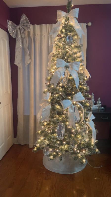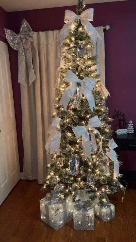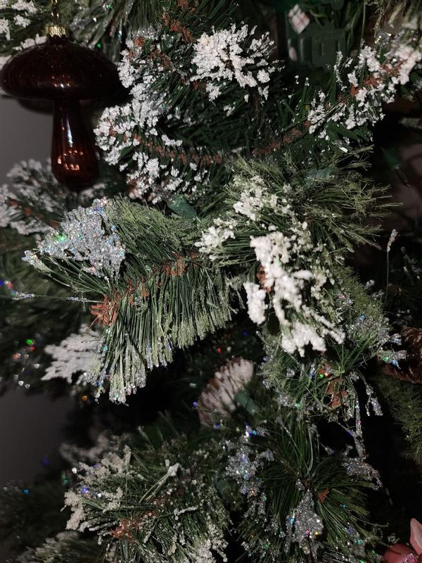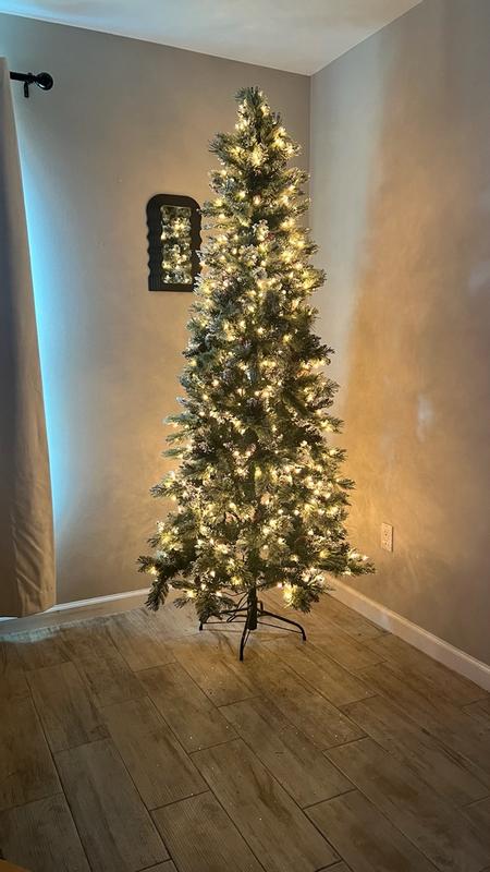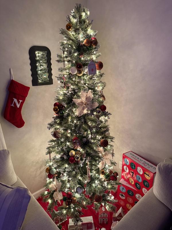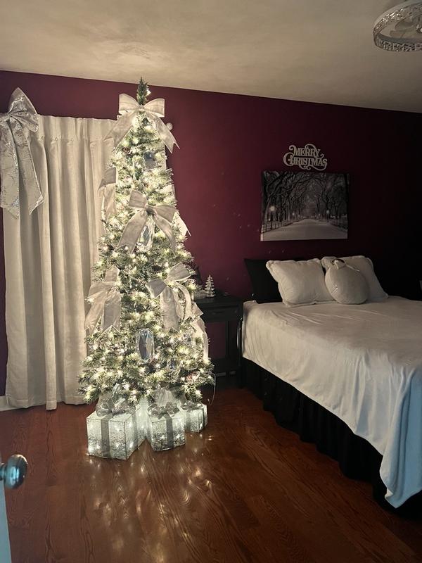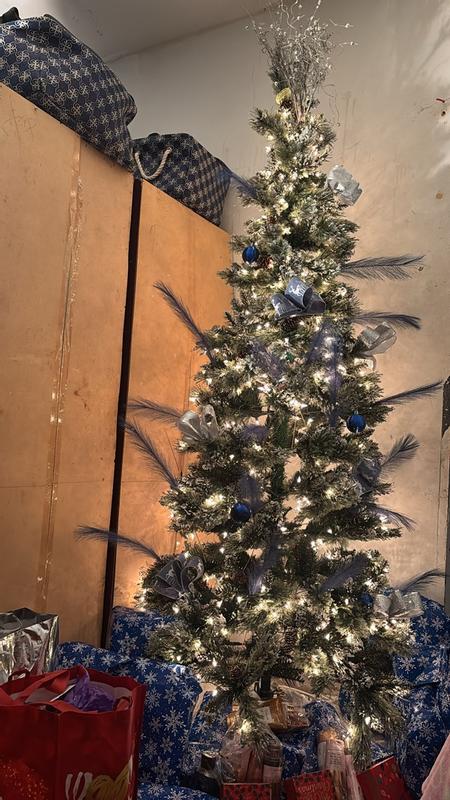 Are we kidding right now !! I am obsessed with this glittery bristle slim tree from National Tree Company .At 7.5 ft in height and a slimmer tree this tree is perfect for a bedroom or basement or any slightly smaller place . It was super easy to put together ,each piece had a numbered tag and u just put the pieces in the holes and then plug like only 2 plugs and voila it’s ready to roll. The glitter effect on the ends is so beautiful I was shocked when it came and it’s iridescent glitter on the ends and not gold I feel like I usually see gold on trees and I am not personally a fan so imagine my surprise when it was beautiful silver glitter . A little messy while putting up but since it’s been up we have no issues with any more messes we also don’t have any kids or pets touching it ,so that helps .I love this tree so much ! Absolutely my new favorite this year and also has been a huge hit with everyone who has seen it