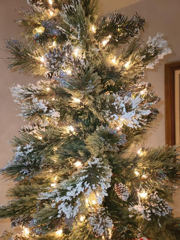 We loved this tree!! It is 7.5Ft tall but slim so it fit PERFECTLY in the corner between our two couches. The tree is flocked, with glitter, and with clear lights. The lights give yellow glow which give our home a nice & cozy vibe. I like it so much I might buy my mom one lol **BE WARNED! Glitter gets EVERYWHERE when setting up. It was easy to clean so we didn’t mind but in case its not your thing