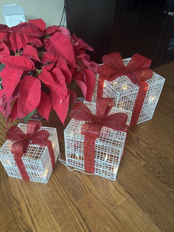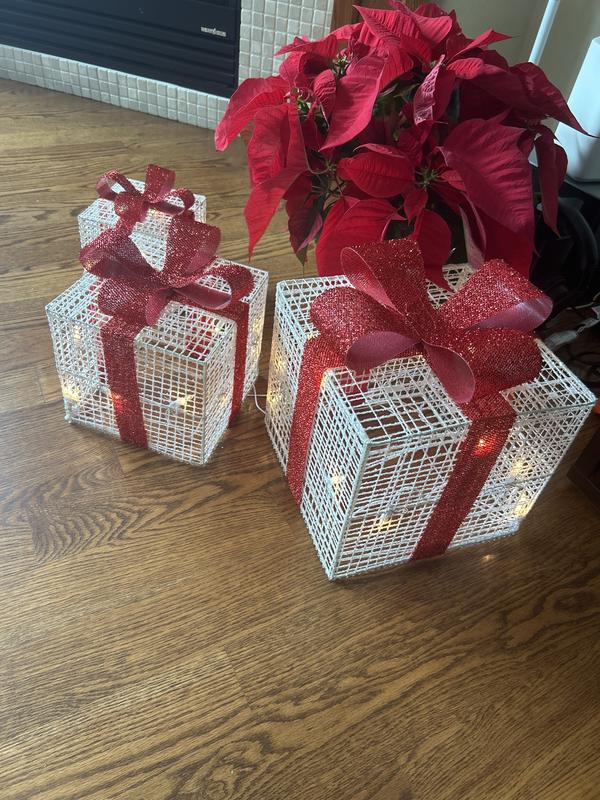 The three lit gift boxes look very festive, and can be used indoors or outdoors. I like the warm lights that create a nice holiday mood.