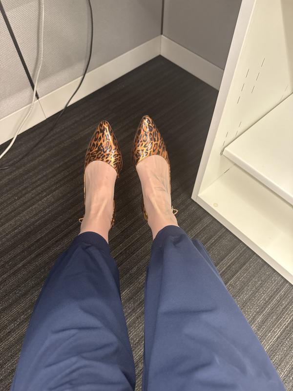 I normally buy size 10 shoes but for wide shoes I go down to 9.5. I had to tighten the back strap to the second last hole. Beautiful animal print! Wore them to the office and felt comfortable all day.