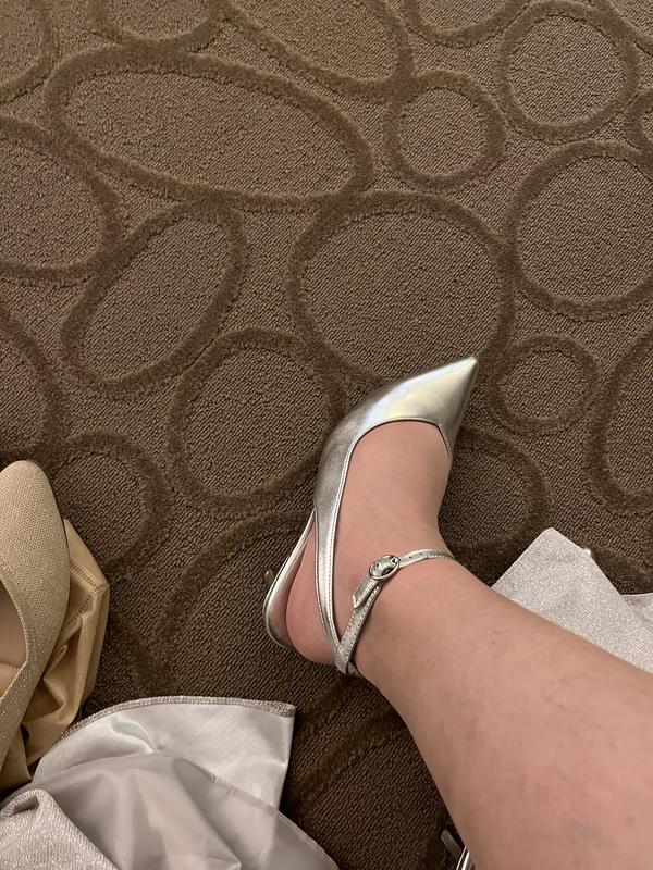 Loved these silver shoes at first glance as the heel is low enough to be able to walk in all day and into the evening. I wore these for my wedding on the beach. It was a “trash the dress and shoe” type situation and I couldn’t be more delighted with the natural ware of the heels after taking a proper beating from the pebbles and ocean on the beach. My only regret is that I didn’t purchase 2 in silver as they are now effectively unwearable. Good thing I bought the pink snake print ones as well. 🤍😁👠