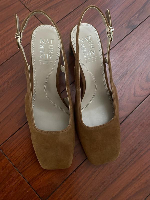 First the good news. For a slingback, that support piece halfway up is a nice feature - when the strap slides off your heel the strap doesn’t fall too far and you should be able to fix the strap in “hands-free”mode. Even though the heel appears to be behind your foot, the heel poses no problem walking. Specific to the brown croc, the leather had more of a distressed look upon arrival. Maybe some shoe polish would have made these shiny and consistent like the photos… The bad: 1) after a short while walking around the house, could feel my toes being squished downward. Slipped my foot out and you could see pressure marks on top of toes. 2) even though this is more square and boxier than naturalizer Karina pump, it felt as though toes were being pushed together more. In a little over an hour, mostly sitting at desk, just wanted to take the Carmen slingback off and return.