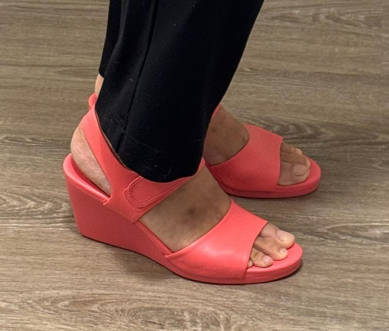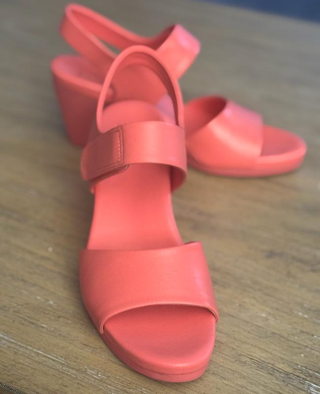 Cute and a vibrant pink color. They’re super comfy and wider foot friendly. Comfortable to walk in and provide good foot support. The heel and straps are thick so it feels secure.