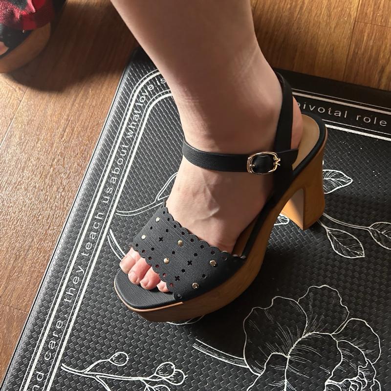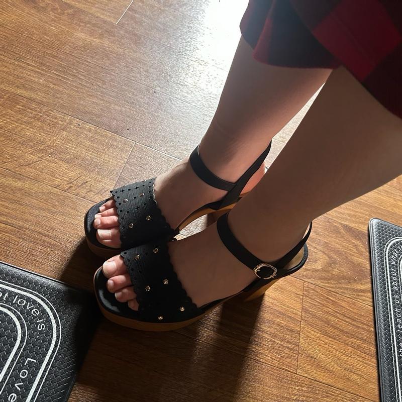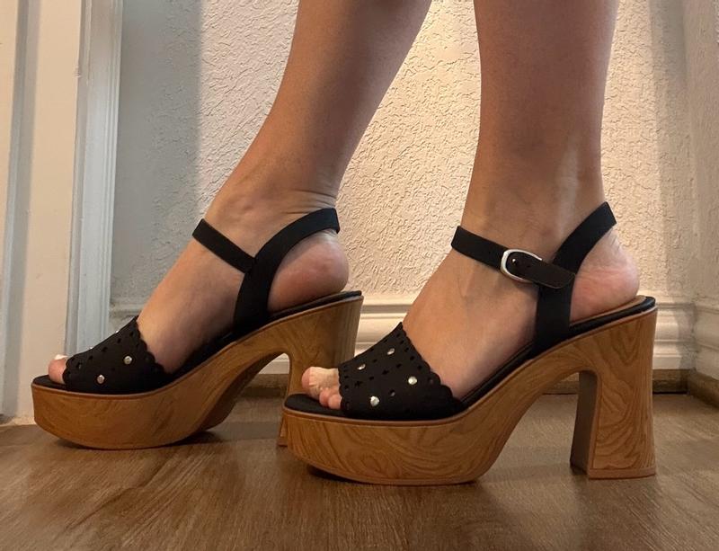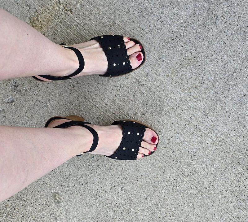 I really love these platform sandals. They are easy to put on an easy to use the latch on the side. They are so comfortable and give me the inches that I need in height. I’ve used them to go out and they are easy to walk on the sidewalk and in the house. I love the design on the top and the silver metal dots on top.