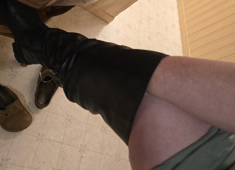 OMG I love these boots!!! I am usually a size 8 and that’s what I bought. But I normally go up a half size or full size in boots so I have some wiggle room wearing socks or tights, and I wish I did, but I don’t want to bother returning them and paying for return shipping. The reviews made the boots sound extremely big, but they are perfect for my 20” calves. I was surprised that they are not a full zipper but a middle zipper, but thankfully I was able to fit my large ankles into them and zip them up. It was a tight fit but they just fit! They are very stylish and a nice height just past the knee. The material is soft leather and the inside feels great on my bare legs. I’m hoping they come out with a brown suede in the exact style and I’ll definitely be purchasing a pair. So happy to have some stylish boots that fit!