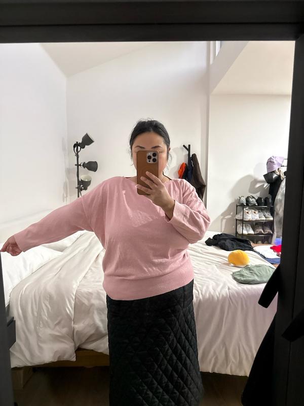 I was a bit hesitant with it being itchy since it’s a glittery top. However, it’s really comfortable and lightweight, and the sleeves are a 3/4th cut, which I enjoy. It keeps me just warm enough in the office where I’m not reaching for a jacket, but I’m not dying of heatstroke. Very excited to have this as an essential wardrobe piece!