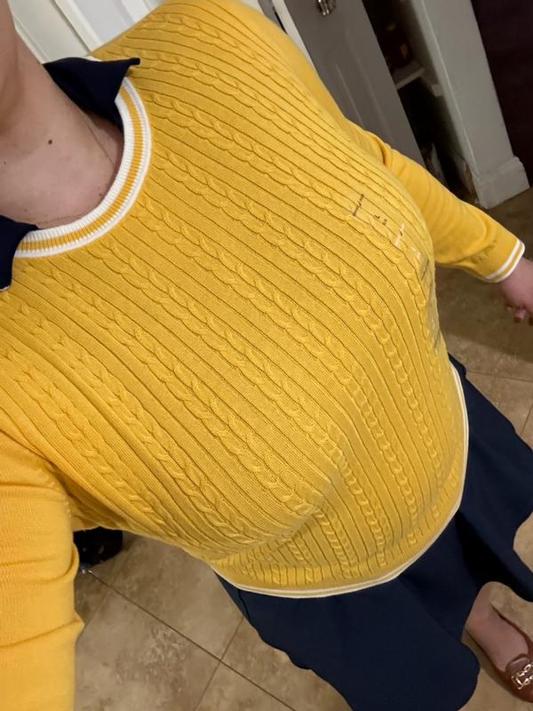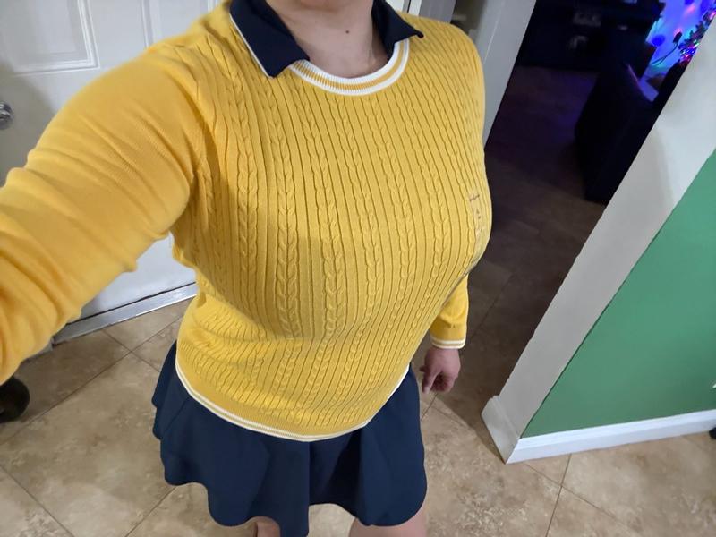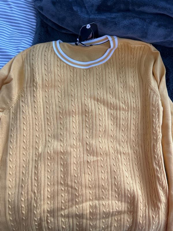 This yellow Náutica sweater is cute! I love the material, the length and style. Very trendy and easy to dress up or down. I thought the design was going to be all over the shirt but it is just the front. It’s not bad though. Overall happy with this sweater