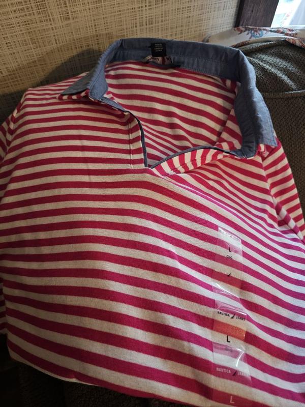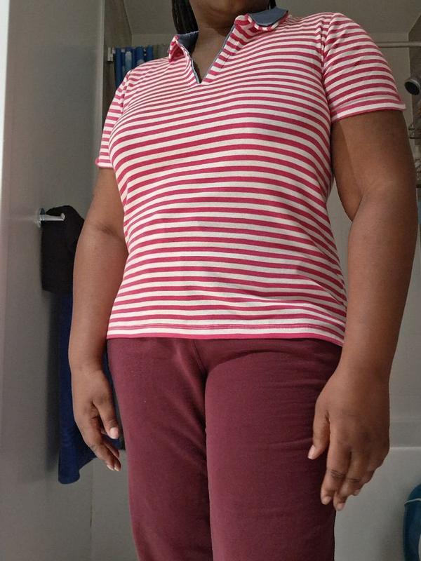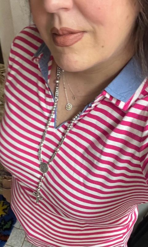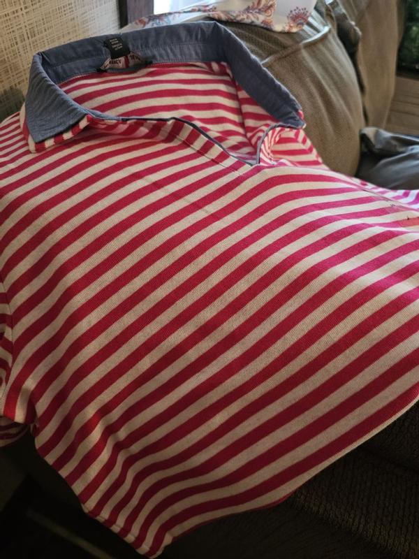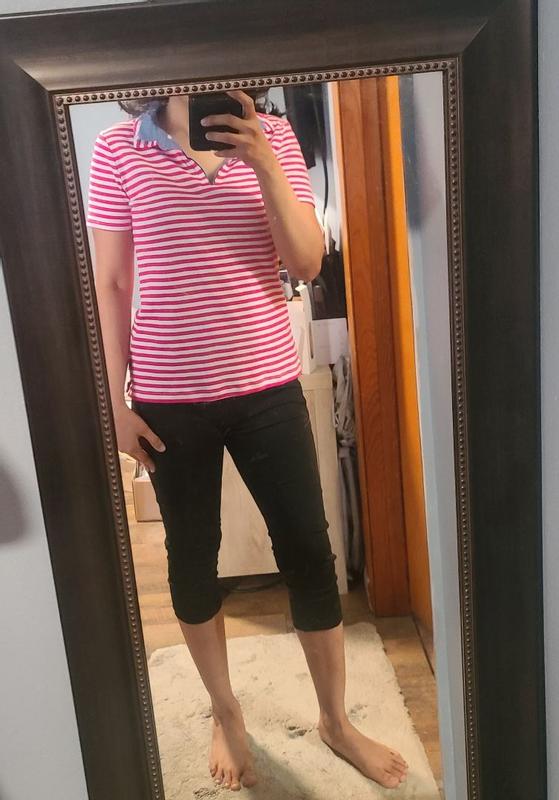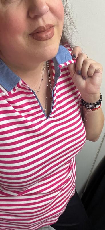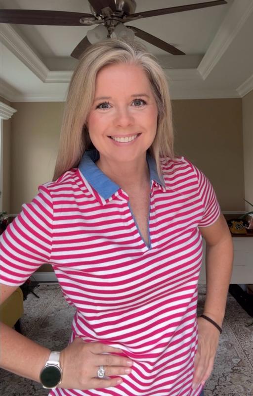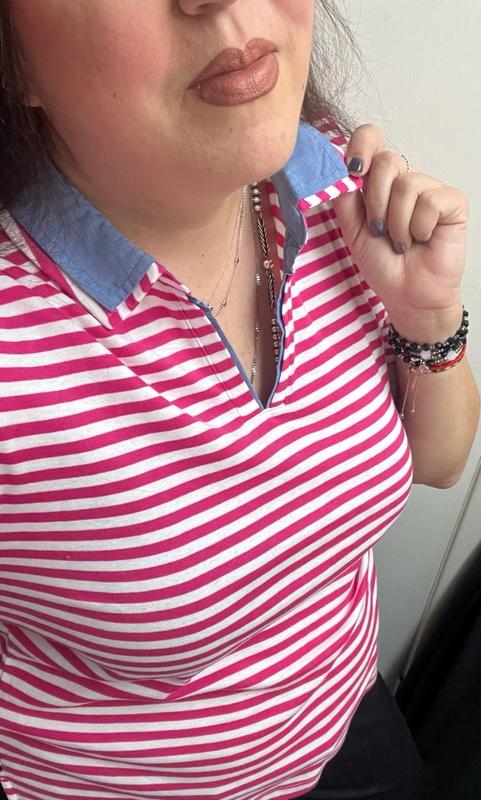 I truly love this polo. It is very feminine and can be worn casually. For a game of tennis or a nice lunch with friends. I wore it to work today and got several compliments since I usually don’t wear collared shirts. But this one is an exception to the rules for me. It’s lightweight and very comfortable.