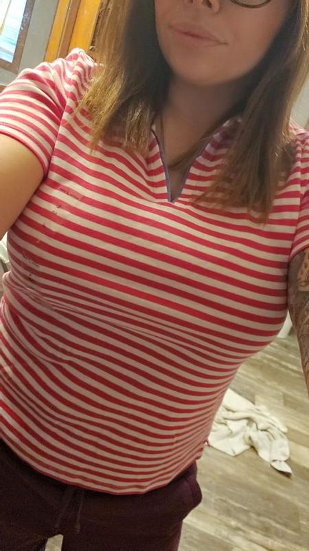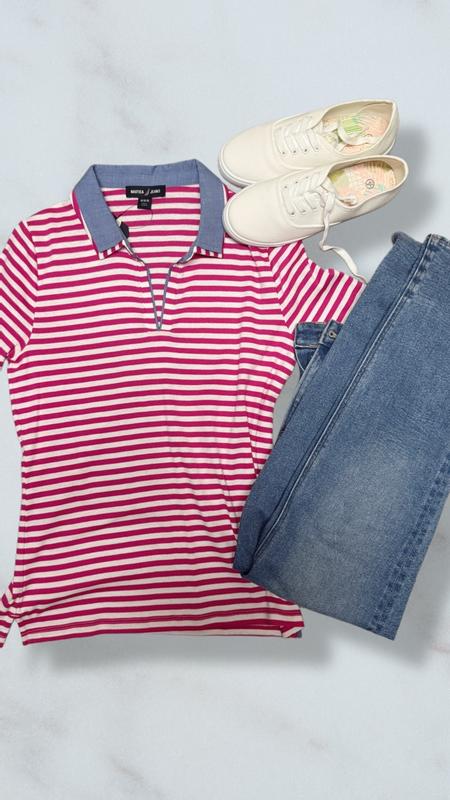 Love the collar on this shirt. I feel like the colored collar and stripes elevate the look giving it a nice preppy and polished feel. Easy to pair with jeans and white sneakers or sandals. The quality is really nice. Feels breathable and washes well. Overall, highly recommend!