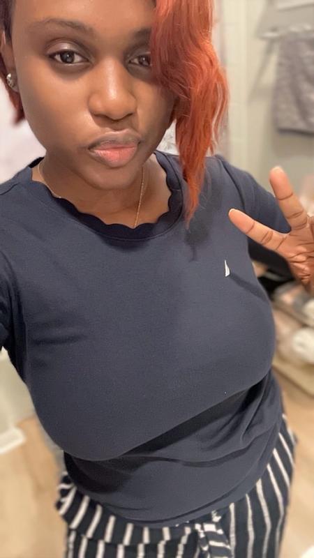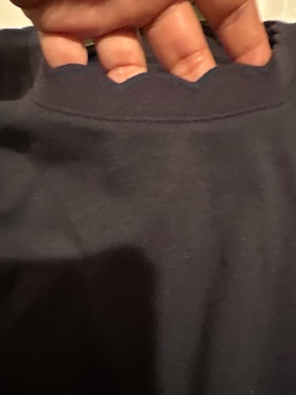 Comfortable all over including the scalloped neckline. Dark blue color did wash out some with first wash. Handle with care.