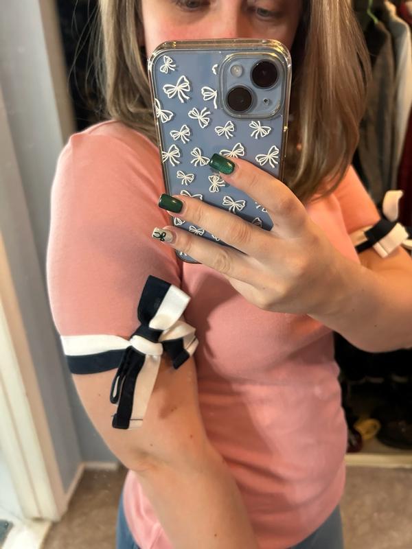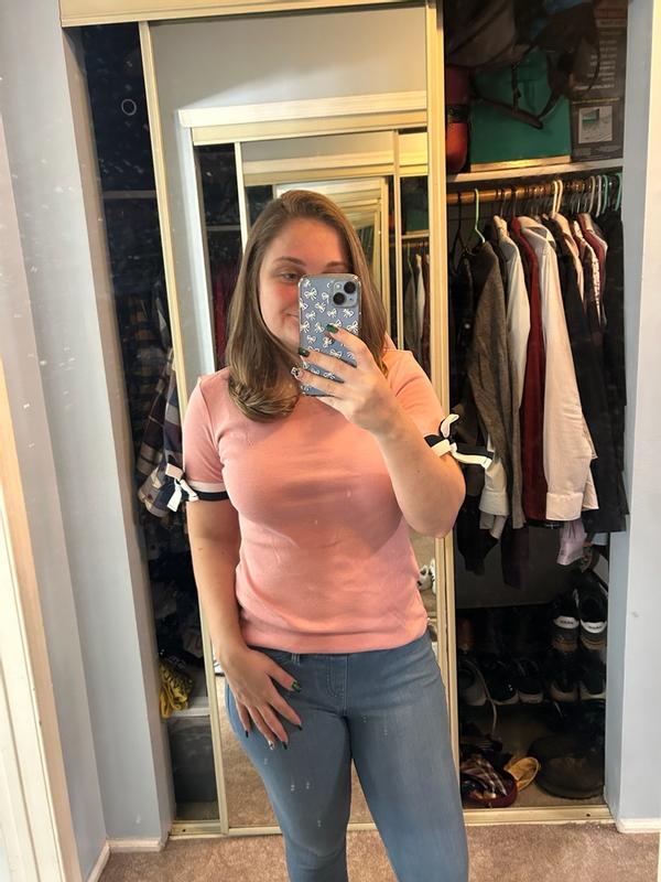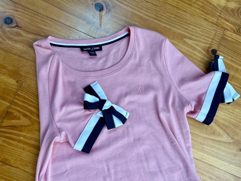 I absolutely love this Nautica shirt! I got it in a medium, and the fit is perfect. The material has amazing stretch all around and even fit on bigger arms so it feels comfortable and flattering without being tight. The little bows on the sleeves add the cutest touch and make it look a bit more dressed up while still being super easy to wear. The bows have perfect details when it comes to the knot and look so beautiful. The shirt is so comfortable and lightweight it’s perfect for everything wear or a night out. Definitely one of those tops you can throw on and instantly feel put together. Highly recommend!