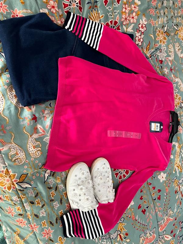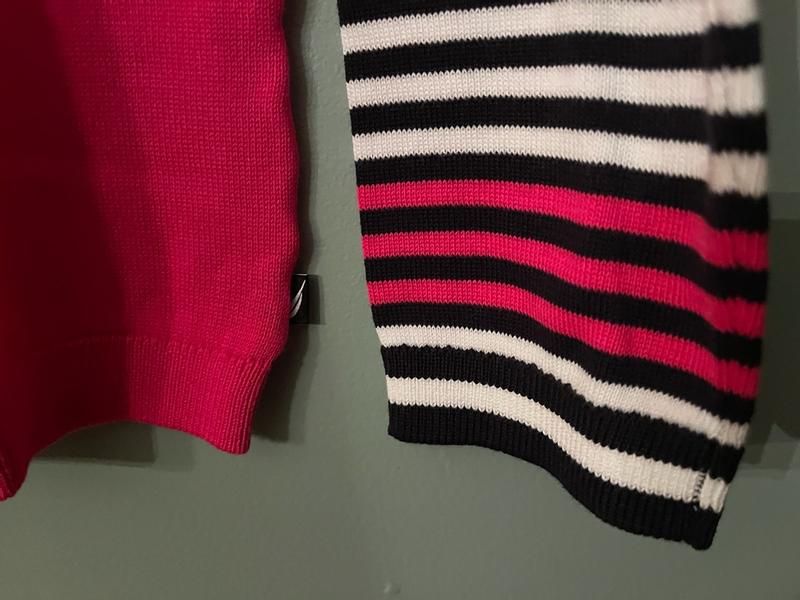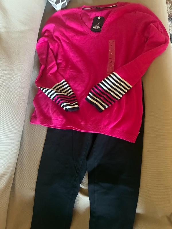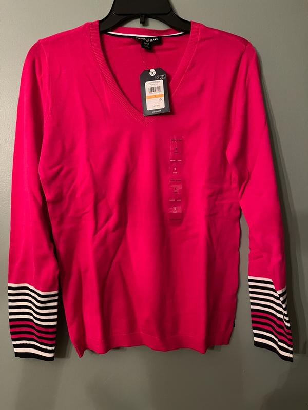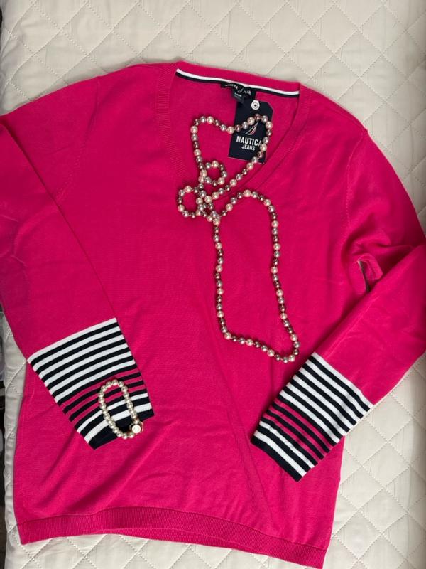 Nautica Women's Cotton V- Neck Sweater is a long sleeved sweater with constrating stripe design at the cuffs. I loved the hot pink color which blends well with my complexion. I received small which fitted my 135 pounds figure perfectly. I have already washed the sweater and I am glad to say it does not pill nor stretch. The sweater material is soft durable cotton that looks stylish and chic. I can see myself wearing it throughout fall and winter. The only thing I dislike is the contrasting stripes at the cuffs which I feel spoil the design of this sweater. Otherwise, a great sweater.