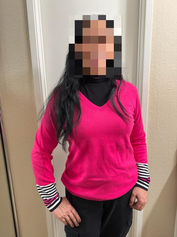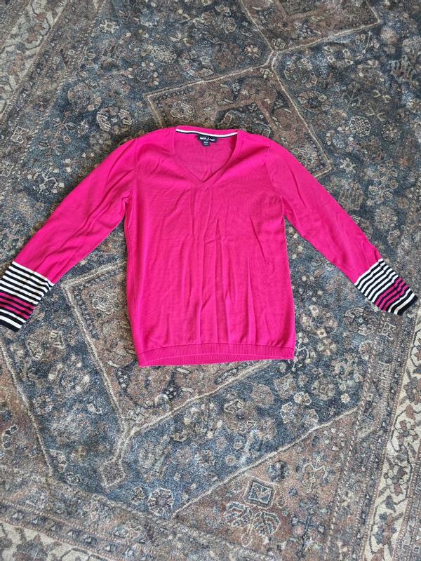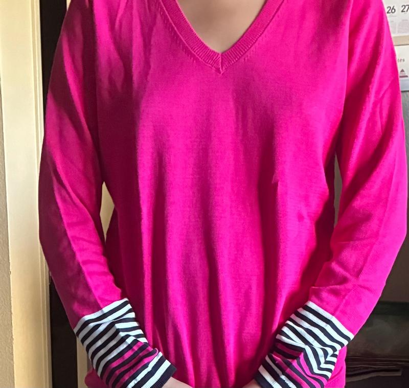 The vibrant shade of pink is a favorite of mine, and this sweater shows it perfectly. I love the v neck, as well as the stripes, which make it very sharp and classy looking. The fabric is very soft,and the knit is well made - high quality top. This pretty sweater can be worn for 3 seasons. It is very pretty and can be dressed up or down. Perfect as a casual look with jeans, or dressy with pointe pants. Highly recommend!