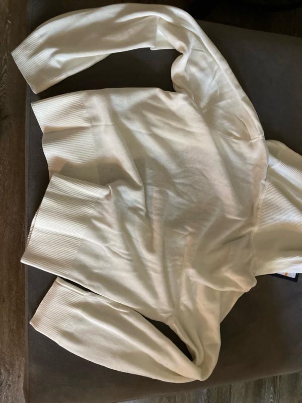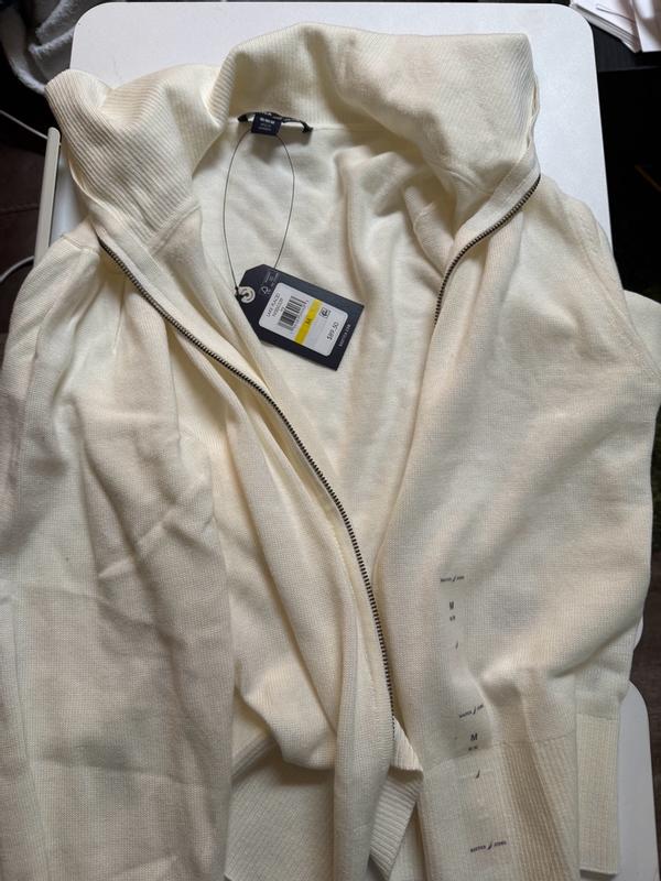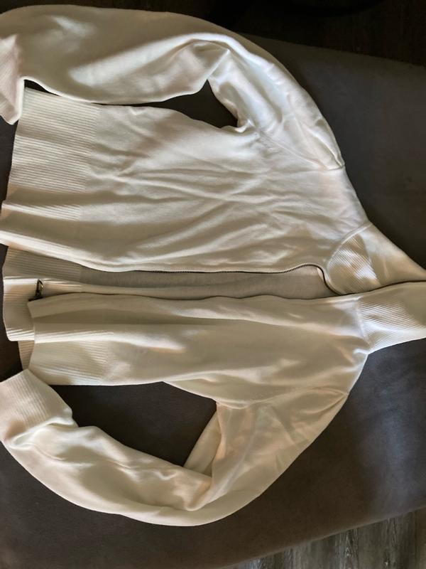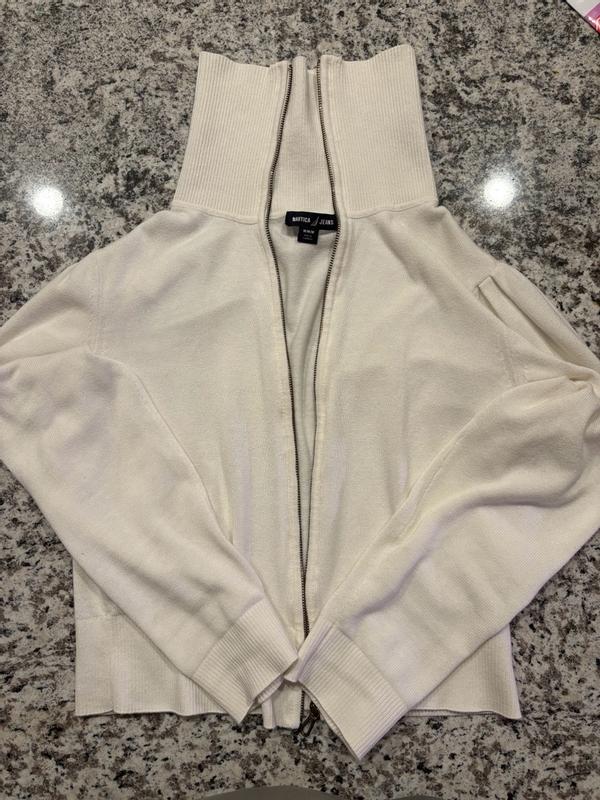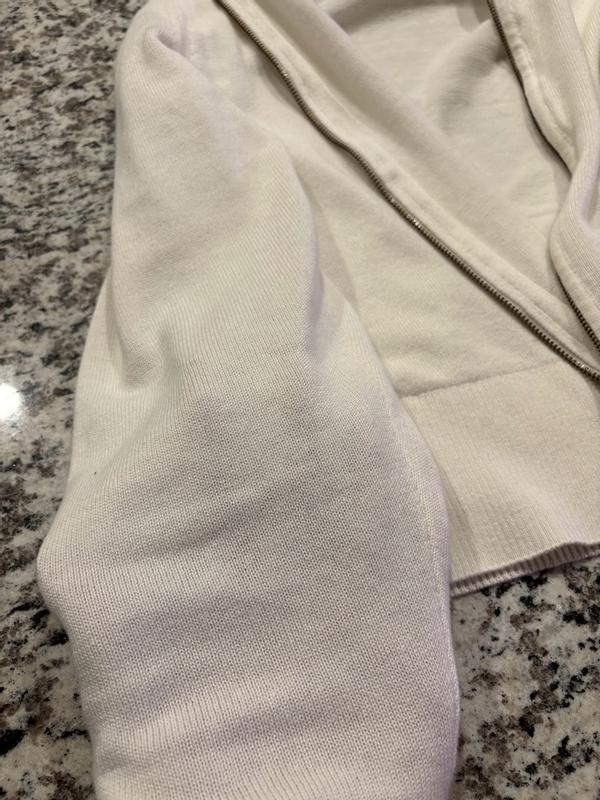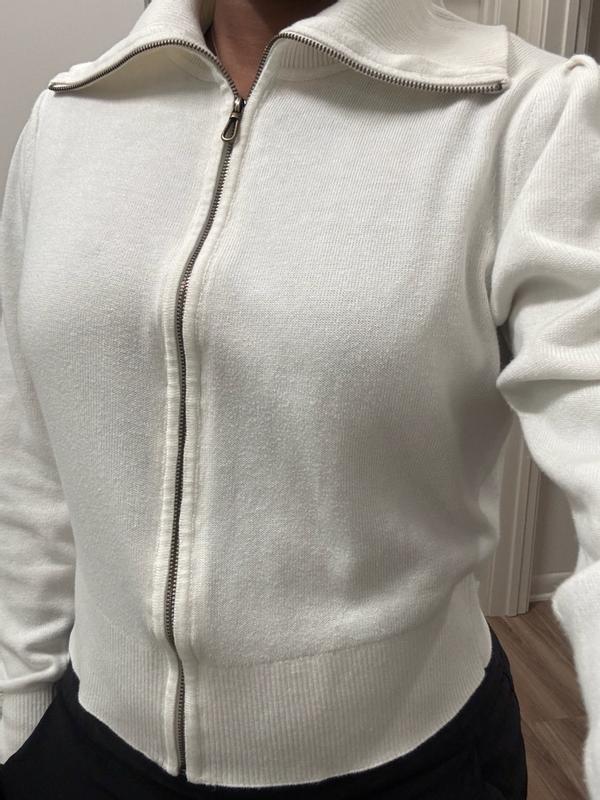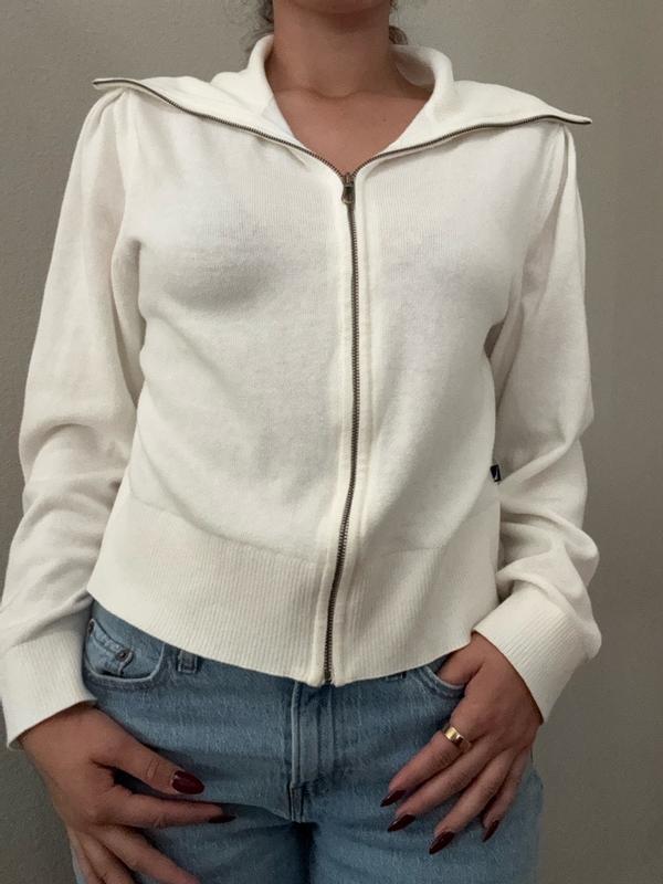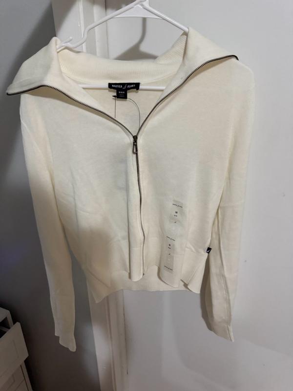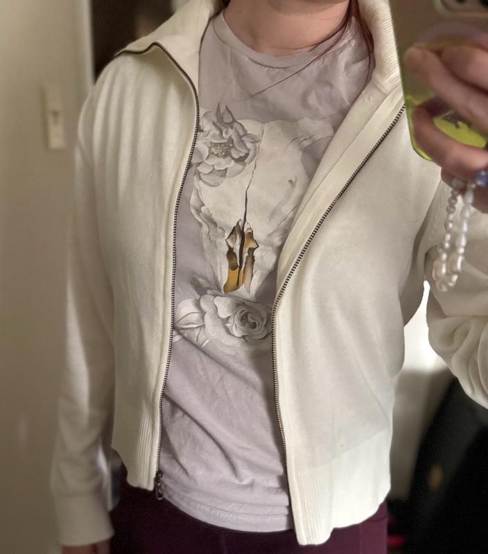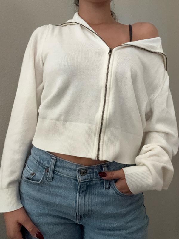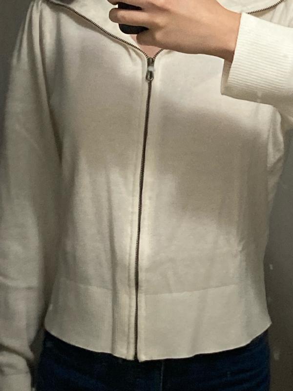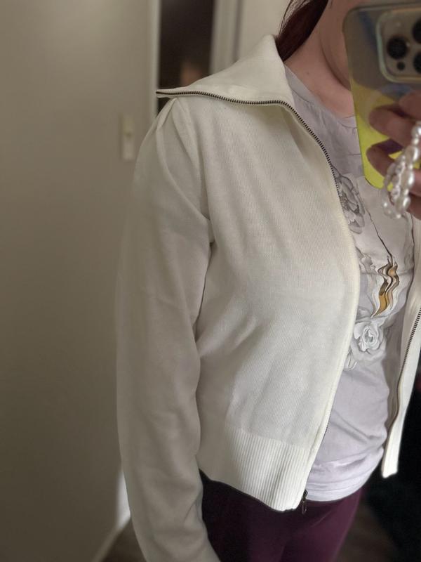 This is a beautiful off white cardigan that is actually super stylish. It's a tad bit cropped but nothing super noticeable. I love the collar part and my niece loved the jacket too. The only part I didn't love was the zipper getting snagged pretty much all the time instead of being smooth.