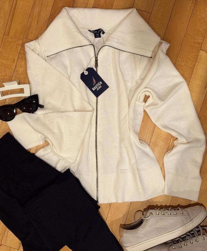This Nautica zip cardigan is stylish, comfortable, and perfect for layering. The ivory color looks elegant and goes well with everything — jeans, skirts, or trousers. The material feels soft and slightly stretchy, giving a flattering fit without being too tight. The zipper works smoothly, and the quality feels durable and well-made. It’s warm enough for cool weather but still lightweight. I also love the structured collar — it adds a polished look. Great piece for both casual and more dressed-up outfits!