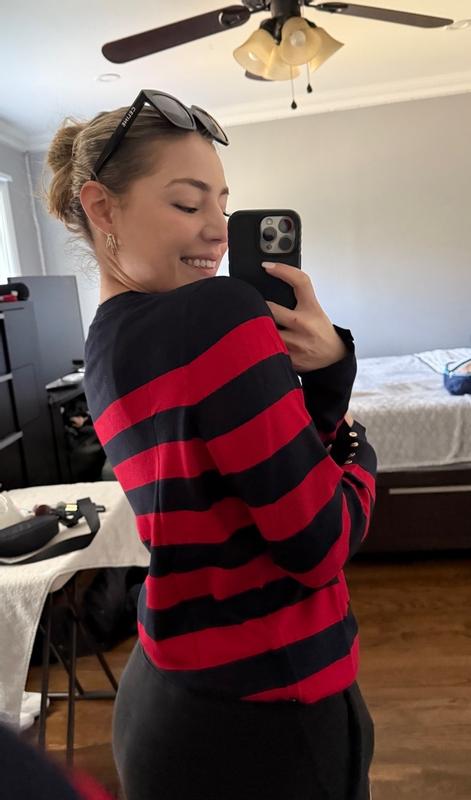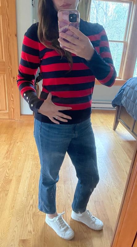 Women's Crewneck Stripe Sweater with Button Sleeve