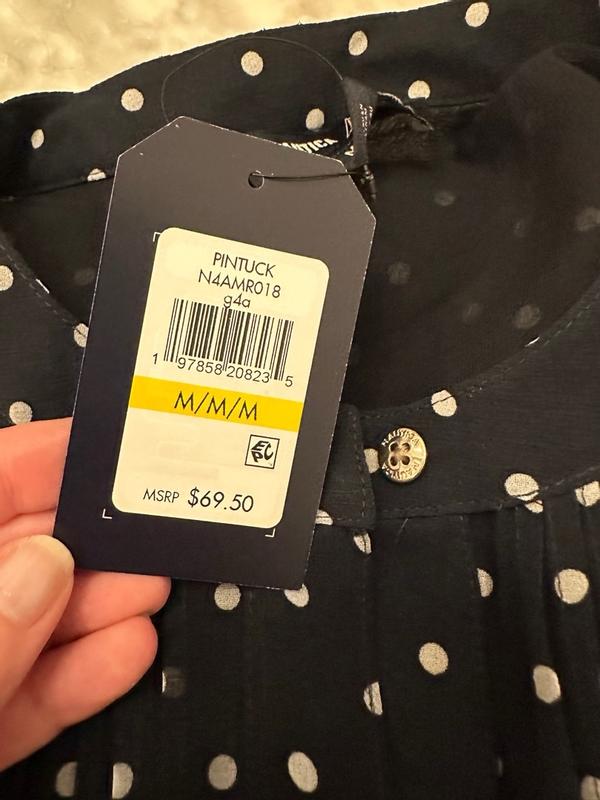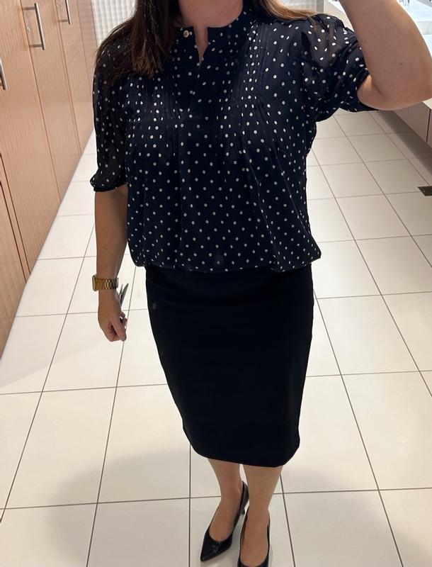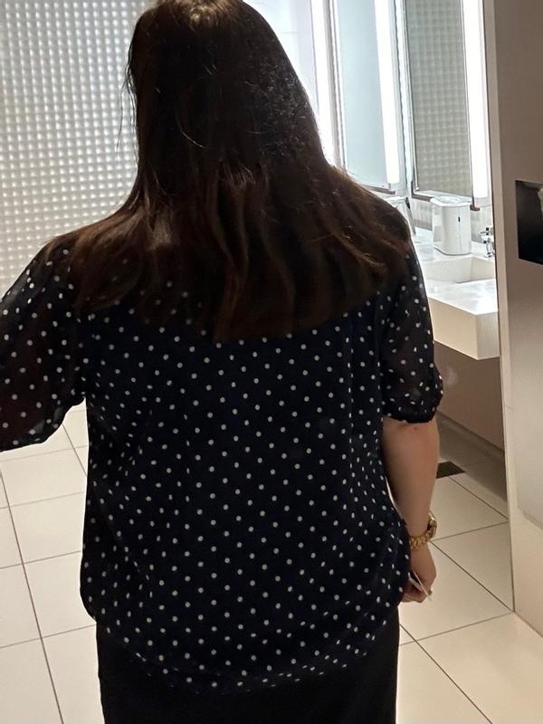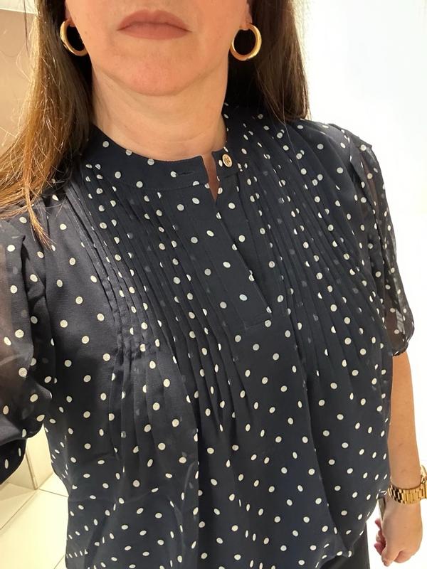 I was thrilled to get this shirt, since I’ve had a similar one in the past that I loved in the classic nautical dark blue with polka dots. The fabric is super soft, and the cut is very flattering on me, with the perfect sleeve length. It’s not only incredibly comfortable, but also elegant and elevates any look. That versatility allows you to easily wear it to work as business casual, or going out for the day, especially during hot summer weather since it’s light and breezy. It also features a double liner so you don’t have to wear another shirt or cami underneath. I would typically wear a 1X, but the XL is just the right size, so be aware that it might run a little big compared to the rest of your wardrobe. It’s extremely well made, with great attention to detail, right down to the buttons. I can absolutely see this piece lasting a long time in my collection!