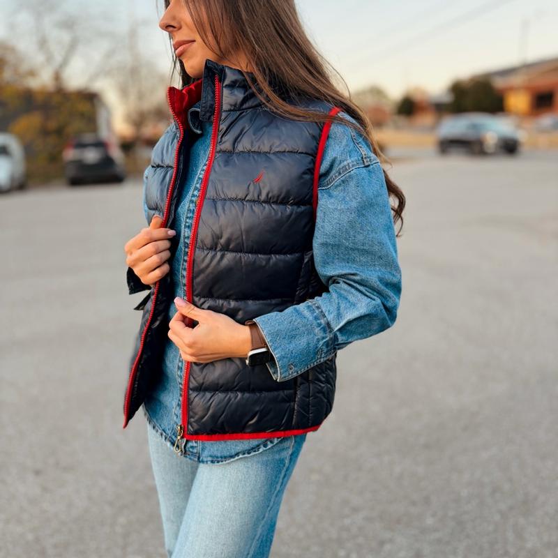 I absolutely love this vest! The navy color with the red trim looks so stylish and versatile. It’s lightweight but still warm, perfect for layering over a denim shirt or sweater. The fit is comfortable and flattering, and the quality feels great. A perfect piece for casual everyday outfits!