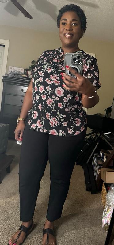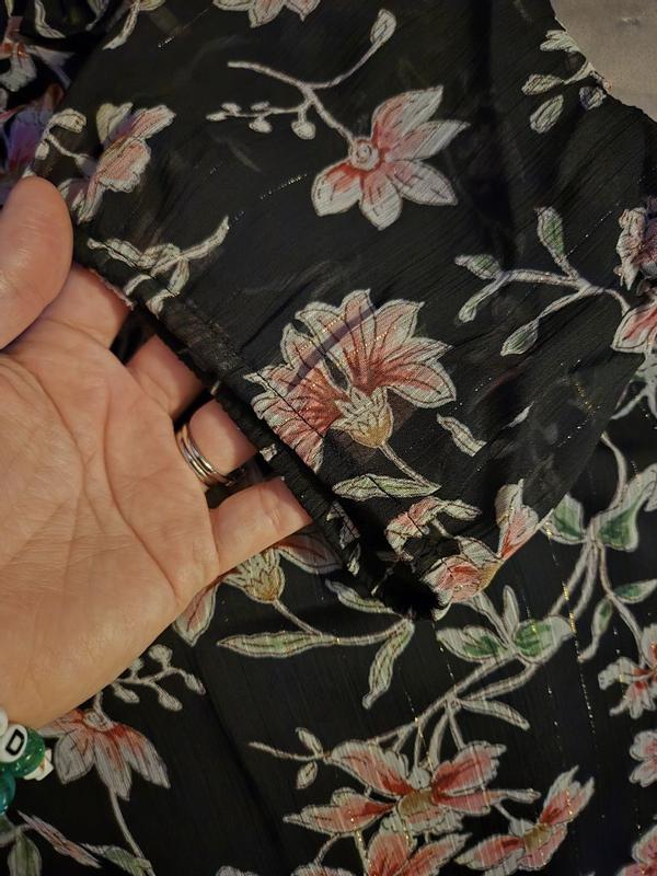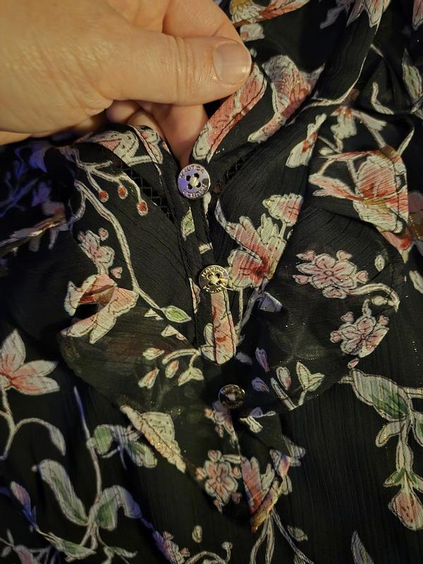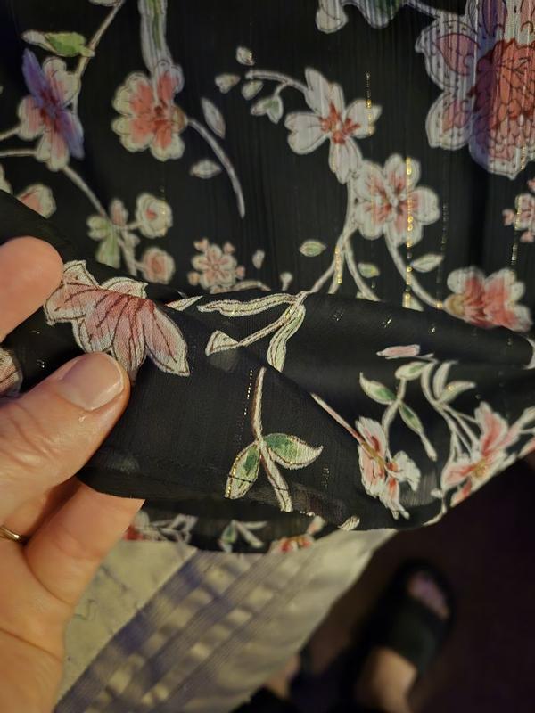 Lovely feminine blouse. The pastel flowers on the black background create a dramatic effect. The thin gold thread adds a touch of sparkle. It can be worn with jeans for a casual look or with a black skirt for the office or even a night out. It can be worn open with a silk cami underneath. Fits true to size. Very well made.