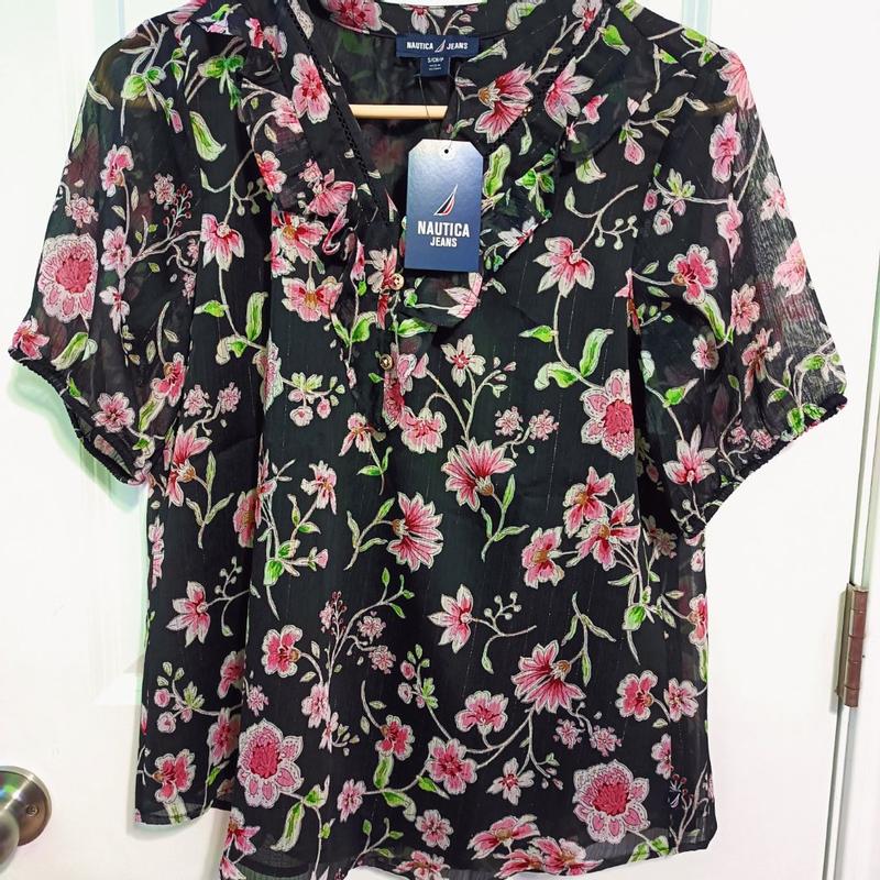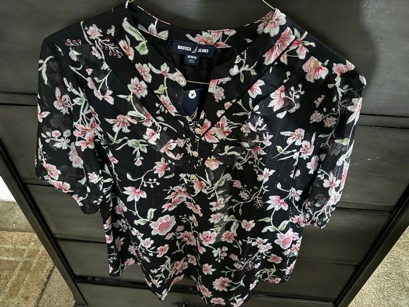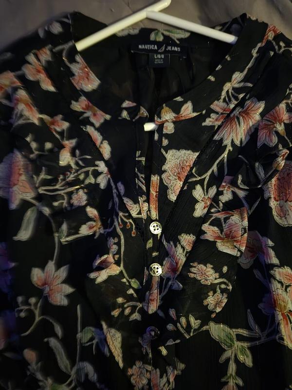 This a cute top with a very pretty print, and I was happy to receive this from Influenster to review. I don’t have any clothes from Nautica Jeans, so this was my first experience with the brand. This seems to be made well - the stitching is well done and it’s nice that this has two layers. The outer sheer layer is bit rougher, so it’s nice to have a softer tank-cut layer underneath for comfort and modesty. I don’t know if this style is for me. I like the floral print and the gold threads in the fabric are actually pretty understated and give a pretty shimmer. But, the buttons and ruffles on top of all that are a bit too much for me.