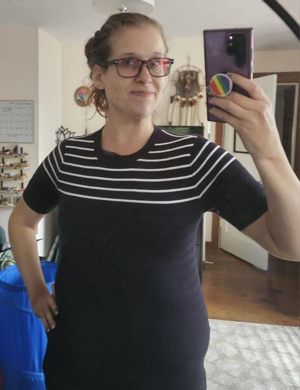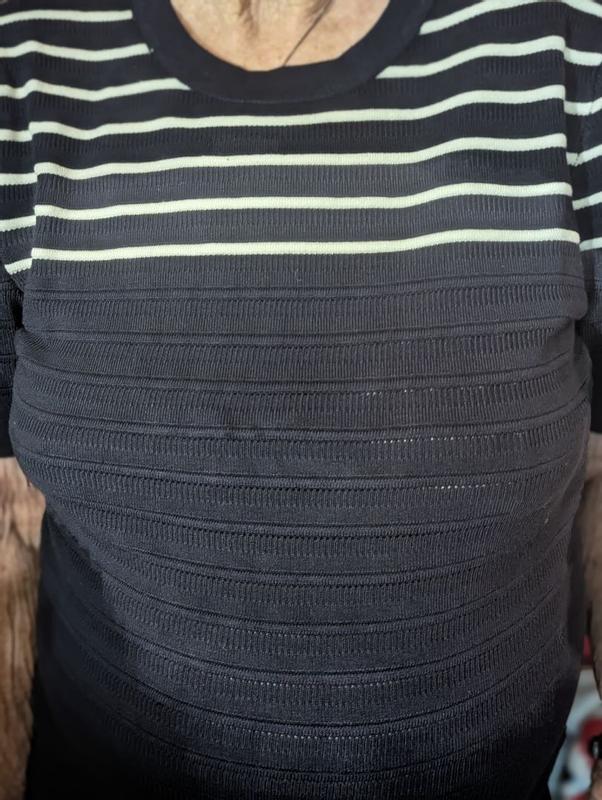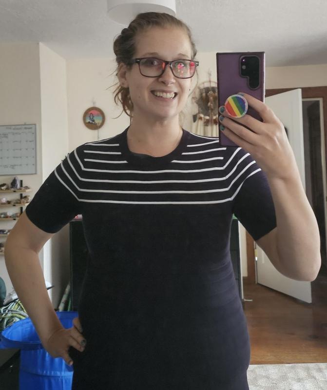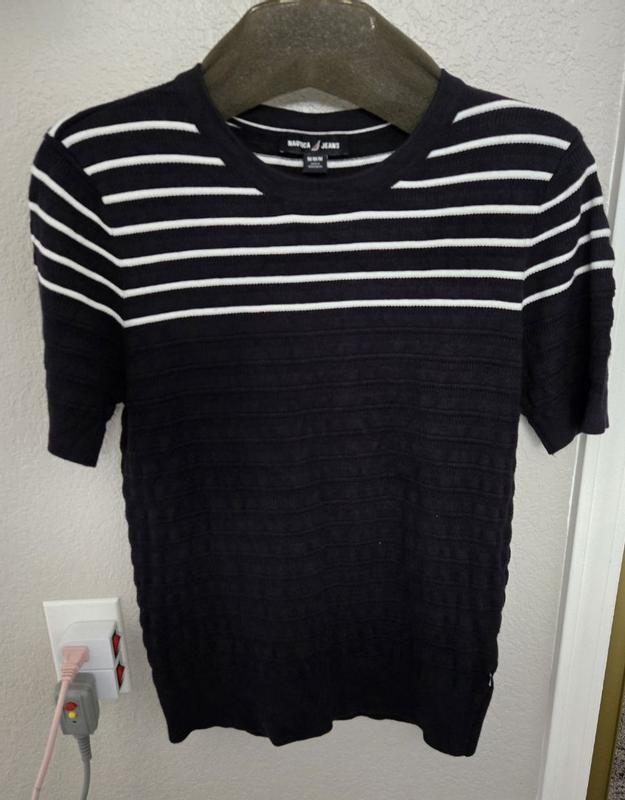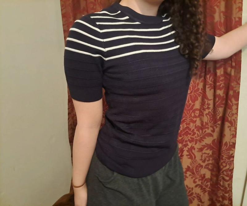 [Incentivized] Loved my Nautica, short sleeve sweater. The material is thick enough to keep me warm during the cool Fall and Spring weather with a cute jean jacket for the weekend or blazer for a business/work day. I'm short, 5'1" so it is a bit long on me, it falls below my stomach. I wish it was a bit shorter but other than that it's beautiful.