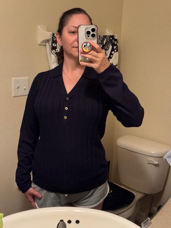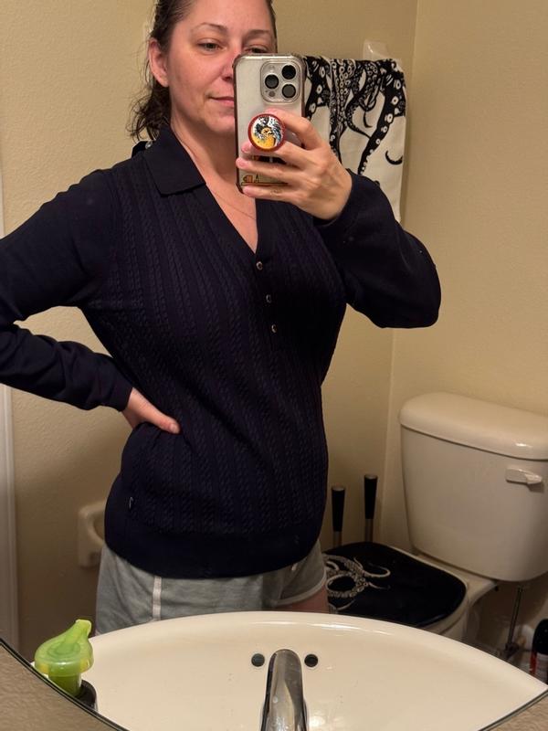 This shirt is very comfortable but flattering. The material is 100% cotton, so it's very soft, and I appreciate the lack of synthetic materials. It fits true to size. Overall, great sweater!
