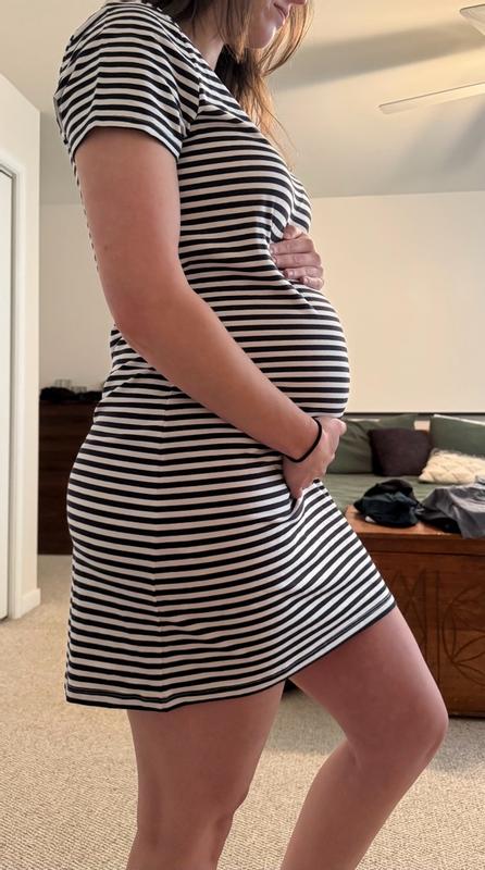 This dress will fit great when I’m not 7.5 months pregnant. It’s a super comfy tshirt dress that isn’t too tight or loose. It’ll be great during the summer months, especially postpartum. The material is soft and the striped print is a nice alternative to a basic. I look forwarding to wearing this when the weather warms up.